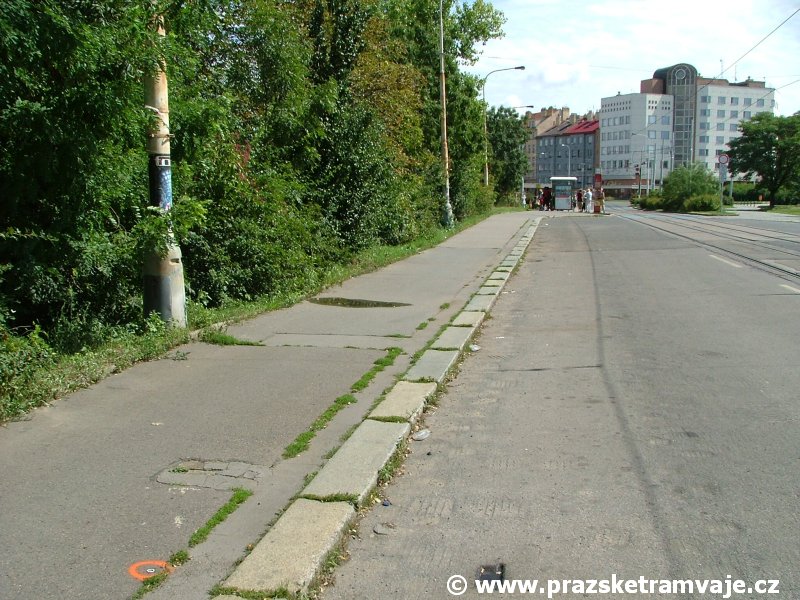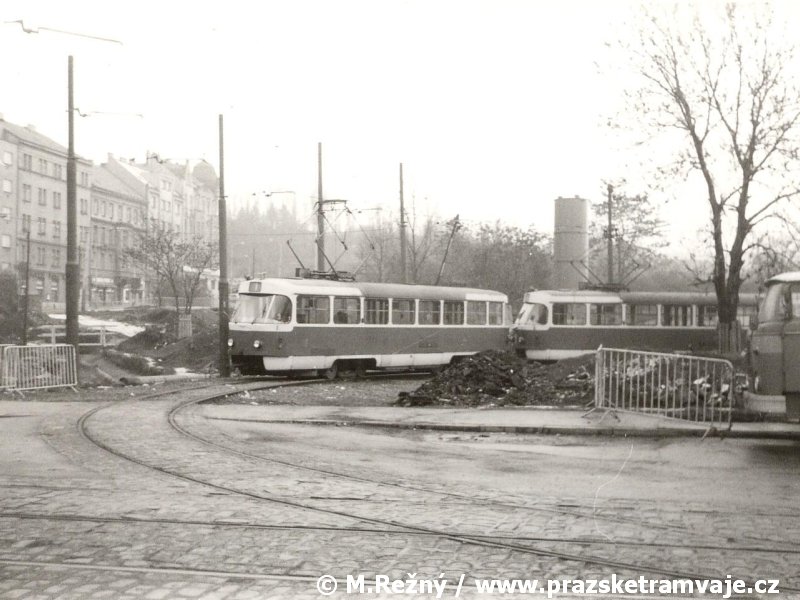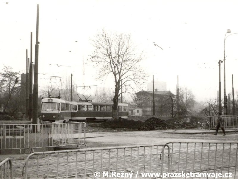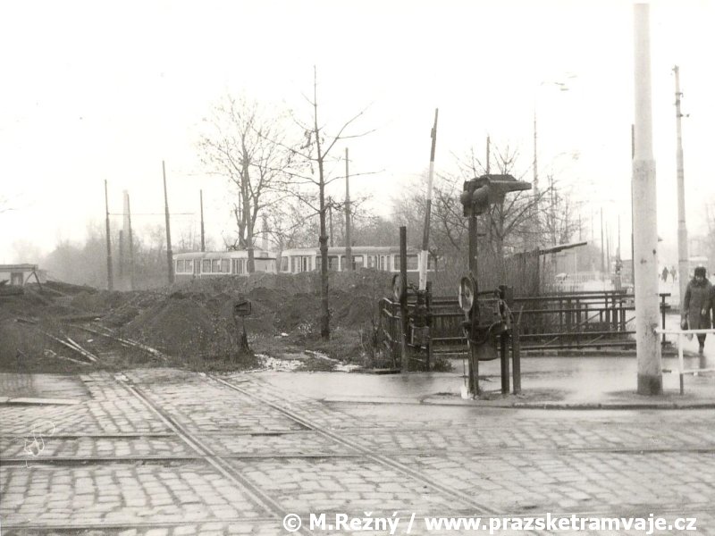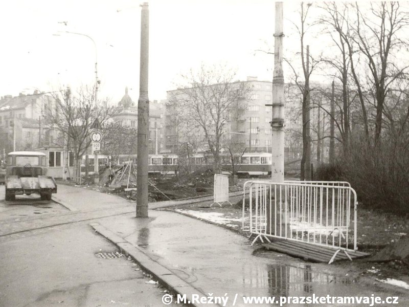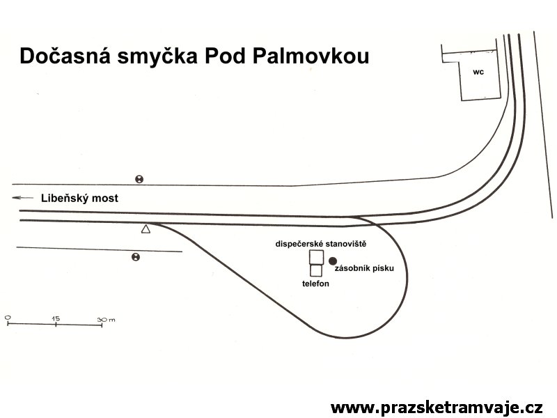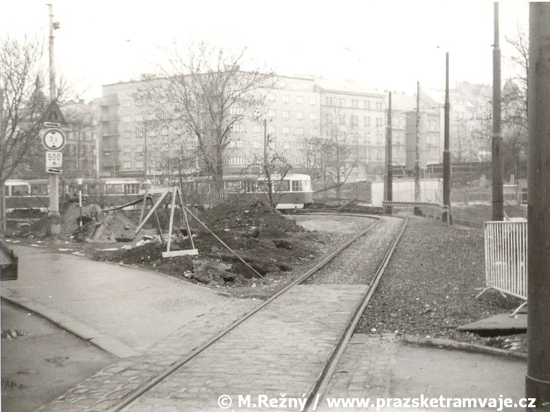 V místě dnešní tramvajové tratě v ulici Na Žertvách vedla trať železniční, kterou tramvaje v Zenklově ulici jednokolejně křižovaly. K tomuto účelu zde dlouhá léta sloužil úrovňový kolejový přejezd ležící zhruba v místě styku dnešní Zenklovy ulice s ulicí Na Žertvách. Narůstající intenzita tramvajové i železniční dopravy přinášela stále větší komplikace, a tak, byla po dokončení tramvajové tratě přes Libeňský most, 28. září 1931 pravidelná tramvajová doprava přes železniční přejezd přerušena. Osobní doprava na železniční trati byla zastavena k 1. červenci 1972, nákladní stále ještě přežívala až do roku 1984, kdy byla železniční trať zcela zrušena a snesena. Přesto oslabená intenzita železničního provozu po roce 1972 umožnila k 29. srpnu 1980 zdvoukolejnit tramvajovou trať v místě křížení s kolejemi železničními a po 49 let trvající přestávce začaly tramvaje přes přejezd přepravovat cestující. Netrvalo to ale dlouho, protože již 21. dubna 1986 byl v souvislosti se zahájením výstavby stanice metra Palmovka provoz na přejezdu opět ukončen. Linka 1, jezdící do té doby přes železniční přejezd, začala do 1. července obracet na kolejovém trojúhelníku původní křižovatky dolní Palmovka. S ohledem na blížící se výstavbu metra a s tím souvisejícím přerušením tramvajového provozu v oblasti Palmovky bylo nutné vyřešit ukončení tramvajových linek od Libeňského mostu ještě před samotnou Palmovkou. Řešení se našlo v podobě zřízení dočasné smyčky, umístěné na předmostí Libeňského mostu. Z tohoto důvodu byly ve výluce tratě trvající od 8. do 18. srpna 1986 vloženy kolejové konstrukce dočasné smyčky Pod Palmovkou, která zahájila provoz 1. září 1986. Na jednokolejné, 146 metrů dlouhé smyčce s vjezdem a výjezdem pouze z Libeňského mostu byl provoz udržován až do 19. května 1990. Zatímco po zbytcích železničního přejezdu, v němž se křižovaly tramvajové koleje s železničními, bychom zbytky stop hledali marně, po smyčce se do dnešních dnů dochovaly alespoň drobné stopy, z nichž nejvýraznější jsou v podobě základů označníků výstupní a nástupní zastávky v chodnících předmostí Libeňského mostu. |
