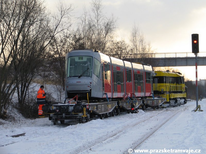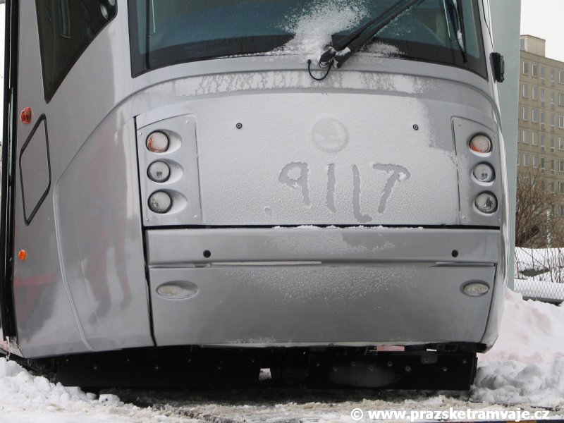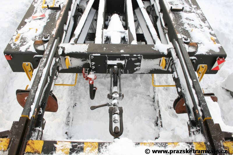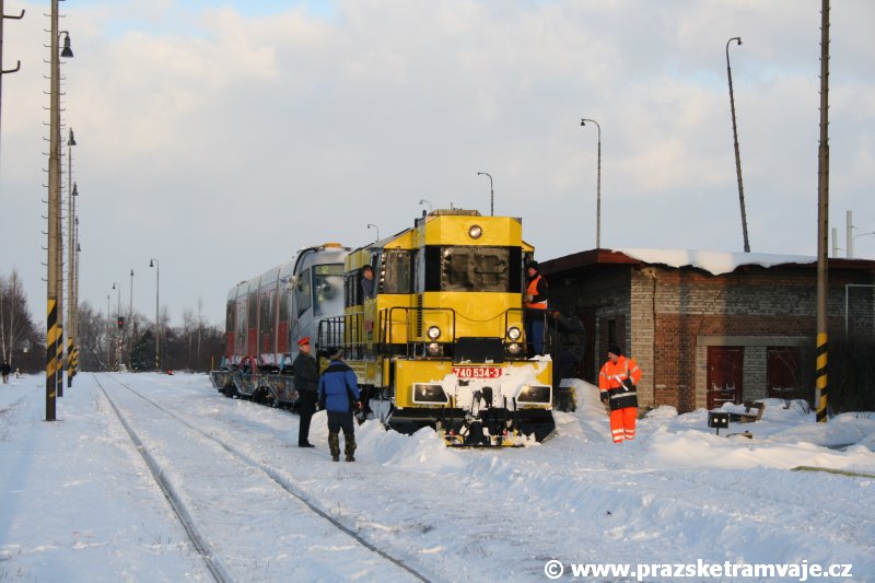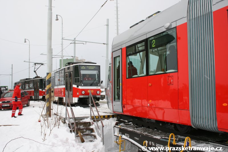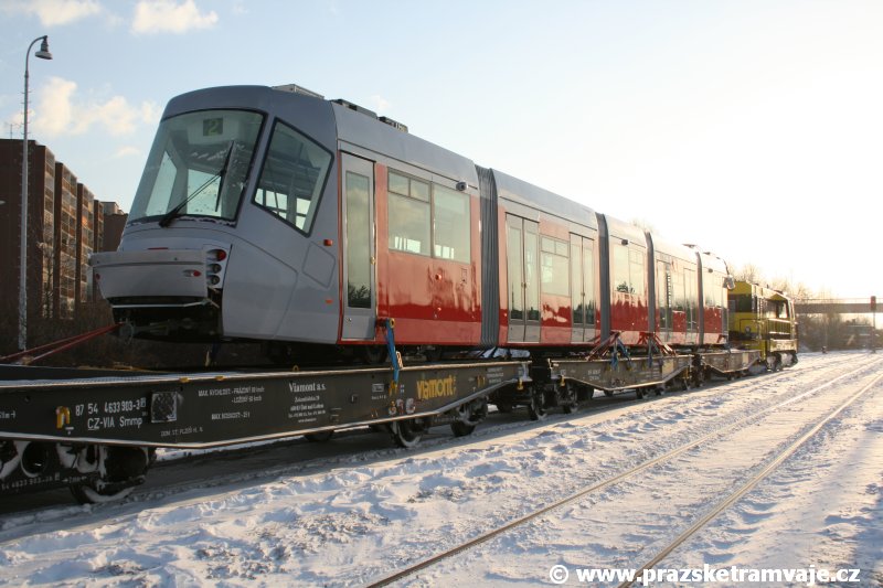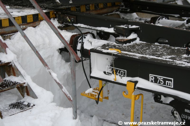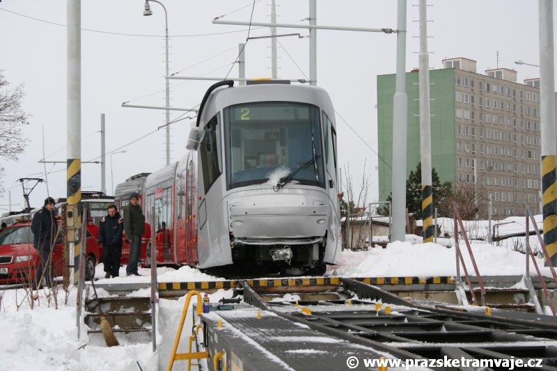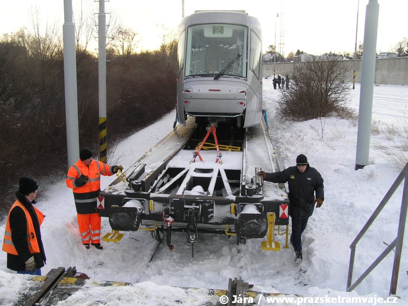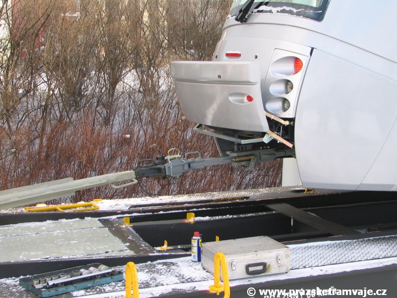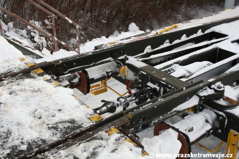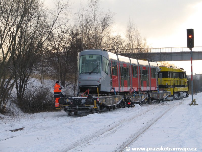 Stejně jako v předešlých případech se přeprava vozu Škoda 14T z plzeňské Škody Transportation uskutečnila po železnici v režii soukromého dopravce Viamont a.s.. Vůz budoucího ev.č.9117 byl 26.ledna 2007 ve 22:00 naložen v areálu Škody Transportation s pomocí portálových jeřábů na plošinové vozy Smmp, a ve 3:30 následujícího dne se vlaková souprava vydala do Prahy. Předávka na pražskou kolejovou síť proběhla opět na kusé předávací koleji nádraží Praha - Zličín. Bohatá sněhová nadílka vlaku zkomplikovala značně cestu, protože bylo nutné vyčkat na odstranění sněhových závějí z železniční tratě u Hostivic. Vlaková souprava složená standardně ze tří plošinových vozů typu Smmp (84 54 4633 904-1, 84 54 4633 903-7, 84 54 4633 902-5), které jsou vzájemně pevně propojeny a jejich ložné plochy uzpůsobeny pro převoz kolejových vozidel, v čele s motorovou lokomotivou 740 534-3, náležící přepravci, firmě Viamont a.s. dorazila na nádraží Praha-Zličín až krátce po půl deváté ráno. Motorová lokomotiva 740 534-3, již přivezla předchozí tramvaj Škoda 14T ev.č.9116 a úspěšně tak nahradila zapůjčenou motorovou lokomotivu 740 469-2. Zličínské nádraží sužovaly v celém kolejišti neodklízené záplavy sněhu, jehož výšku ještě umocnil vítr, který jej navál k čelu rampy předávací koleje. Již v pátek 26. ledna 2007 byli na kusou předávací kolej vysláni pracovníci vrchní stavby Dopravního podniku Praha, aby kolej připravili na dnešní akci. Z kolejiště Českých drah bohužel nikdo sníh neodstranil, proto pracovníci firmy Viamont, a.s. po příjezdu vlaku vyrazili vstříc sněhové nadílce s hrábly a košťaty, aby odstranili sníh z výkolejky, výhybky i okolí předávací koleje a zajistili tak bezpečné složení vozu. Na místě byli opět i pracovníci vrchní stavby Dopravního podniku, kteří dočišťovali od předchozího dne opět zasněženou kusou předávací kolej. Po dvaceti minutách od příjezdu na nádraží Praha-Zličín lokomotiva 740 534-3 posunula naloženou tramvaj Škoda 14T ev.č.9117 k rampě kusé předávací koleje, kde proběhlo ukotvení vagónů k rampě. Již v 8:15 dorazila na místo souprava vozů T6A5 ev.č.8713+8714, určená k vytažení vozu. Po oživení a vyzkoušení funkce kolejnicové brzdy nové tramvaje (ještě na železničních vozech) započalo v 9:45 její vytahování. Samotný přesun vozu Škoda 14T na pražské koleje byl opět dílem okamžiku. Při následném pokusu o oživení vozu se však nedařilo elektricky zdvihnout pantograf do pracovní polohy na trolej, pokusy o nouzové mechanické zdvižení také nedopadly úspěšně. Bylo proto nutné vypnout napájení troleje na kusé předávací koleji a pracovník Škody Transportation s pomocí skládacího žebříku vylezl na střechu vozu, kde přimrzlý pantograf mechanicky uvolnil. V 10:05 se vůz vlastní silou přesunul na vnější kolej smyčky Sídliště Řepy a v cca 10:15 se za hustého sněžení přepravil vlastní silou do domovské motolské vozovny. Skládání nových vozů Škoda 14T na pražské koleje pokaždé přináší něco nového, takže doufejme, že ani příjezd vozu ev.č.9118 nebude výjimkou a Pražské tramvaje nabídnou svým čtenářům opět sadu zajímavých fotografií. |
