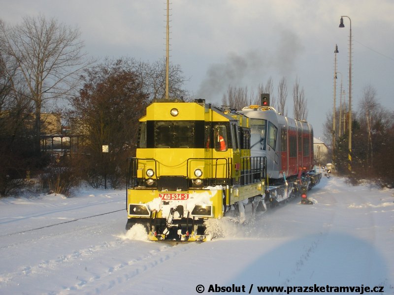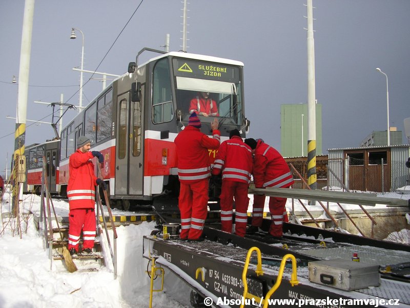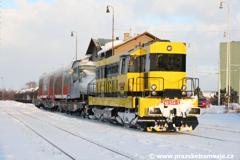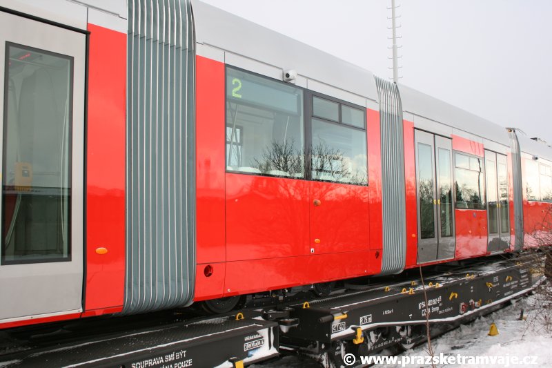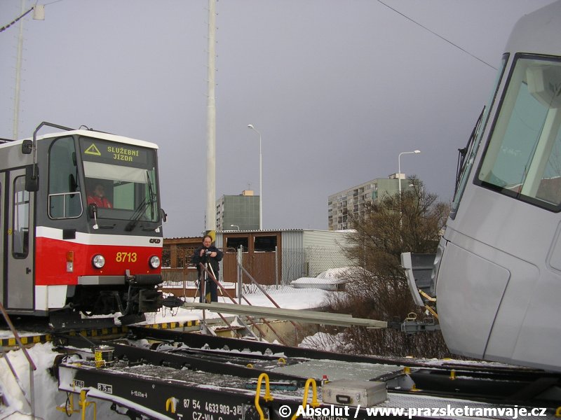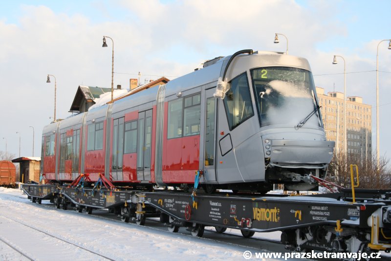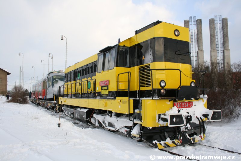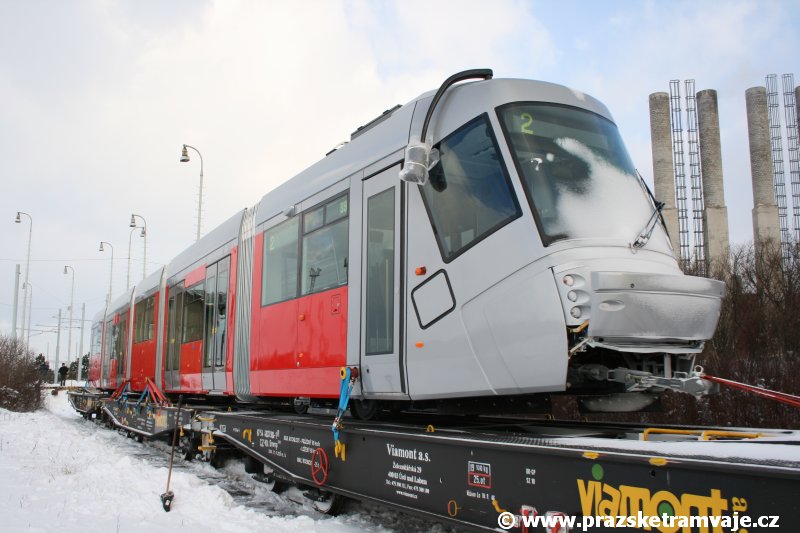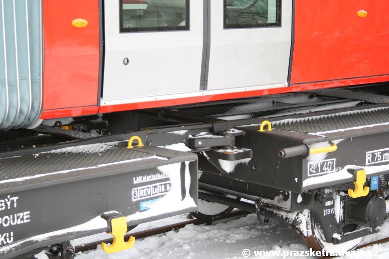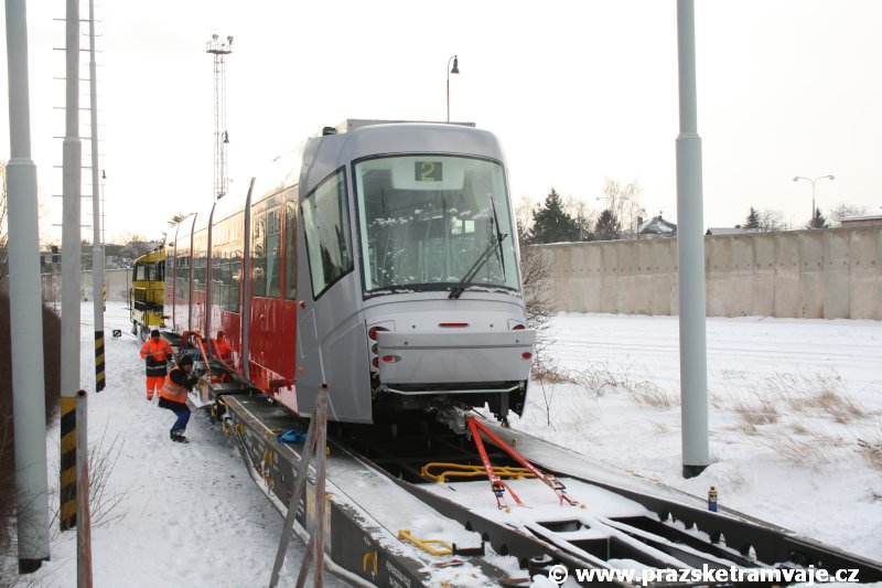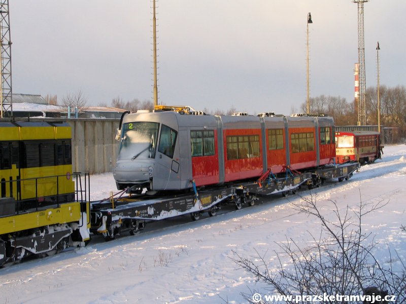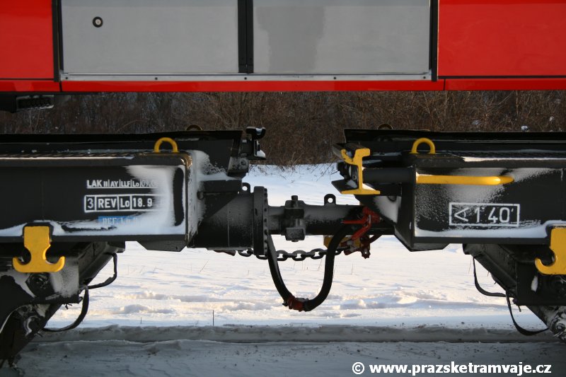 Stejně jako v předešlých případech se přeprava vozu Škoda 14T z plzeňské Škody Transportation uskutečnila po železnici v režii soukromého dopravce Viamont a.s.. Vůz budoucího ev.č.9117 byl 26.ledna 2007 ve 22:00 naložen v areálu Škody Transportation s pomocí portálových jeřábů na plošinové vozy Smmp, a ve 3:30 následujícího dne se vlaková souprava vydala do Prahy. Předávka na pražskou kolejovou síť proběhla opět na kusé předávací koleji nádraží Praha - Zličín. Bohatá sněhová nadílka vlaku zkomplikovala značně cestu, protože bylo nutné vyčkat na odstranění sněhových závějí z železniční tratě u Hostivic. Vlaková souprava složená standardně ze tří plošinových vozů typu Smmp (84 54 4633 904-1, 84 54 4633 903-7, 84 54 4633 902-5), které jsou vzájemně pevně propojeny a jejich ložné plochy uzpůsobeny pro převoz kolejových vozidel, v čele s motorovou lokomotivou 740 534-3, náležící přepravci, firmě Viamont a.s. dorazila na nádraží Praha-Zličín až krátce po půl deváté ráno. Motorová lokomotiva 740 534-3, již přivezla předchozí tramvaj Škoda 14T ev.č.9116 a úspěšně tak nahradila zapůjčenou motorovou lokomotivu 740 469-2. Zličínské nádraží sužovaly v celém kolejišti neodklízené záplavy sněhu, jehož výšku ještě umocnil vítr, který jej navál k čelu rampy předávací koleje. Již v pátek 26. ledna 2007 byli na kusou předávací kolej vysláni pracovníci vrchní stavby Dopravního podniku Praha, aby kolej připravili na dnešní akci. Z kolejiště Českých drah bohužel nikdo sníh neodstranil, proto pracovníci firmy Viamont, a.s. po příjezdu vlaku vyrazili vstříc sněhové nadílce s hrábly a košťaty, aby odstranili sníh z výkolejky, výhybky i okolí předávací koleje a zajistili tak bezpečné složení vozu. Na místě byli opět i pracovníci vrchní stavby Dopravního podniku, kteří dočišťovali od předchozího dne opět zasněženou kusou předávací kolej. Po dvaceti minutách od příjezdu na nádraží Praha-Zličín lokomotiva 740 534-3 posunula naloženou tramvaj Škoda 14T ev.č.9117 k rampě kusé předávací koleje, kde proběhlo ukotvení vagónů k rampě. Již v 8:15 dorazila na místo souprava vozů T6A5 ev.č.8713+8714, určená k vytažení vozu. Po oživení a vyzkoušení funkce kolejnicové brzdy nové tramvaje (ještě na železničních vozech) započalo v 9:45 její vytahování. Samotný přesun vozu Škoda 14T na pražské koleje byl opět dílem okamžiku. Při následném pokusu o oživení vozu se však nedařilo elektricky zdvihnout pantograf do pracovní polohy na trolej, pokusy o nouzové mechanické zdvižení také nedopadly úspěšně. Bylo proto nutné vypnout napájení troleje na kusé předávací koleji a pracovník Škody Transportation s pomocí skládacího žebříku vylezl na střechu vozu, kde přimrzlý pantograf mechanicky uvolnil. V 10:05 se vůz vlastní silou přesunul na vnější kolej smyčky Sídliště Řepy a v cca 10:15 se za hustého sněžení přepravil vlastní silou do domovské motolské vozovny. Skládání nových vozů Škoda 14T na pražské koleje pokaždé přináší něco nového, takže doufejme, že ani příjezd vozu ev.č.9118 nebude výjimkou a Pražské tramvaje nabídnou svým čtenářům opět sadu zajímavých fotografií. |