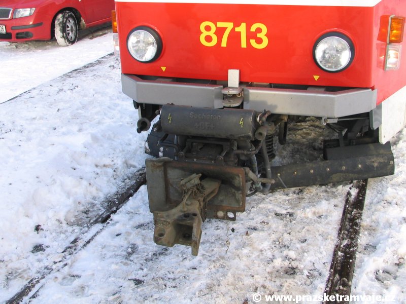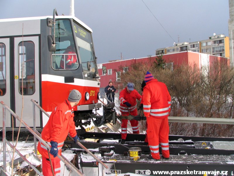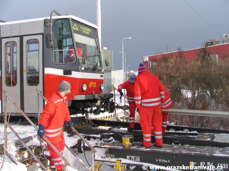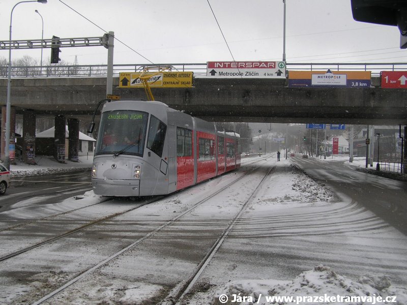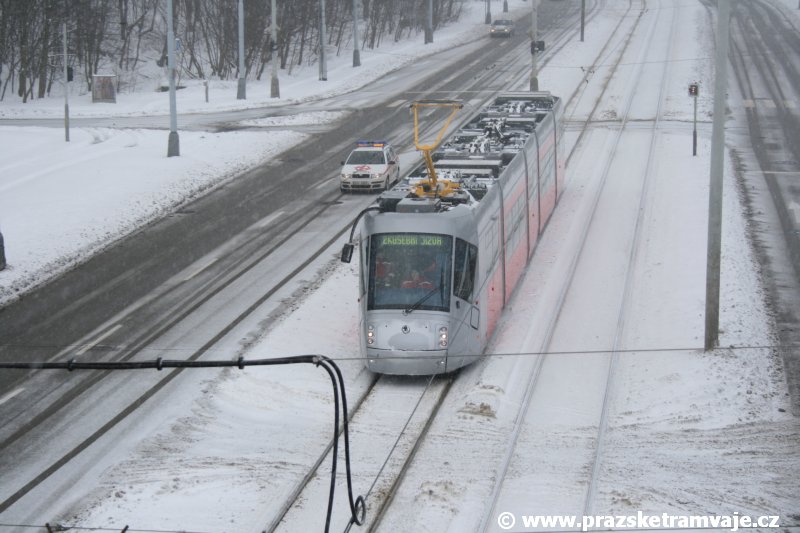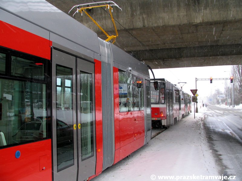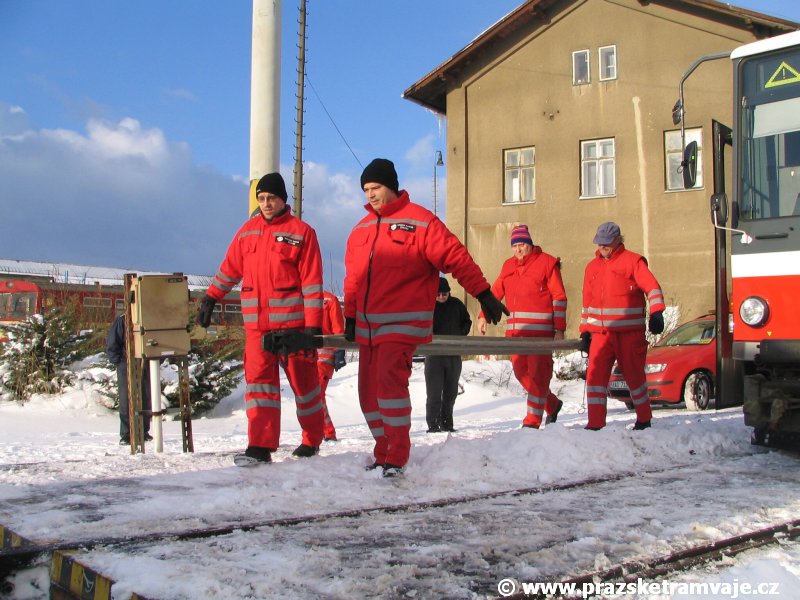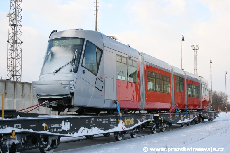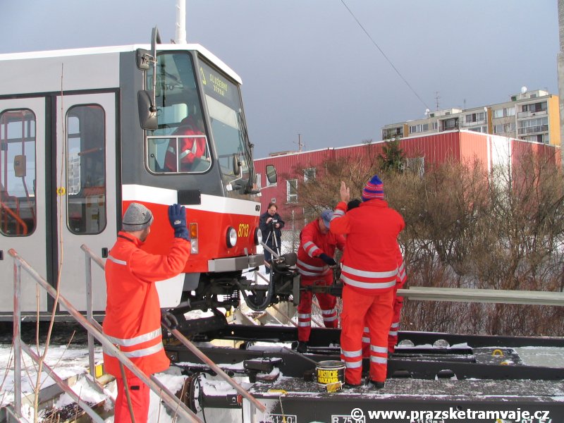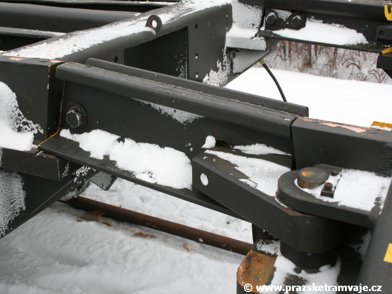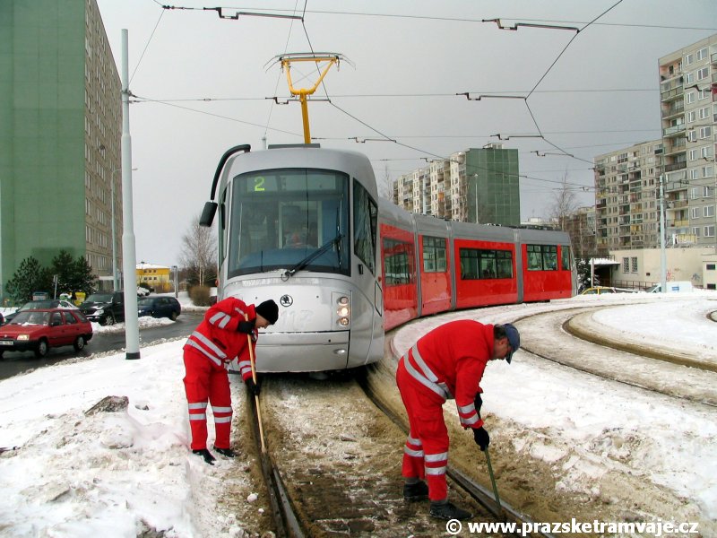 Stejně jako v předešlých případech se přeprava vozu Škoda 14T z plzeňské Škody Transportation uskutečnila po železnici v režii soukromého dopravce Viamont a.s.. Vůz budoucího ev.č.9117 byl 26.ledna 2007 ve 22:00 naložen v areálu Škody Transportation s pomocí portálových jeřábů na plošinové vozy Smmp, a ve 3:30 následujícího dne se vlaková souprava vydala do Prahy. Předávka na pražskou kolejovou síť proběhla opět na kusé předávací koleji nádraží Praha - Zličín. Bohatá sněhová nadílka vlaku zkomplikovala značně cestu, protože bylo nutné vyčkat na odstranění sněhových závějí z železniční tratě u Hostivic. Vlaková souprava složená standardně ze tří plošinových vozů typu Smmp (84 54 4633 904-1, 84 54 4633 903-7, 84 54 4633 902-5), které jsou vzájemně pevně propojeny a jejich ložné plochy uzpůsobeny pro převoz kolejových vozidel, v čele s motorovou lokomotivou 740 534-3, náležící přepravci, firmě Viamont a.s. dorazila na nádraží Praha-Zličín až krátce po půl deváté ráno. Motorová lokomotiva 740 534-3, již přivezla předchozí tramvaj Škoda 14T ev.č.9116 a úspěšně tak nahradila zapůjčenou motorovou lokomotivu 740 469-2. Zličínské nádraží sužovaly v celém kolejišti neodklízené záplavy sněhu, jehož výšku ještě umocnil vítr, který jej navál k čelu rampy předávací koleje. Již v pátek 26. ledna 2007 byli na kusou předávací kolej vysláni pracovníci vrchní stavby Dopravního podniku Praha, aby kolej připravili na dnešní akci. Z kolejiště Českých drah bohužel nikdo sníh neodstranil, proto pracovníci firmy Viamont, a.s. po příjezdu vlaku vyrazili vstříc sněhové nadílce s hrábly a košťaty, aby odstranili sníh z výkolejky, výhybky i okolí předávací koleje a zajistili tak bezpečné složení vozu. Na místě byli opět i pracovníci vrchní stavby Dopravního podniku, kteří dočišťovali od předchozího dne opět zasněženou kusou předávací kolej. Po dvaceti minutách od příjezdu na nádraží Praha-Zličín lokomotiva 740 534-3 posunula naloženou tramvaj Škoda 14T ev.č.9117 k rampě kusé předávací koleje, kde proběhlo ukotvení vagónů k rampě. Již v 8:15 dorazila na místo souprava vozů T6A5 ev.č.8713+8714, určená k vytažení vozu. Po oživení a vyzkoušení funkce kolejnicové brzdy nové tramvaje (ještě na železničních vozech) započalo v 9:45 její vytahování. Samotný přesun vozu Škoda 14T na pražské koleje byl opět dílem okamžiku. Při následném pokusu o oživení vozu se však nedařilo elektricky zdvihnout pantograf do pracovní polohy na trolej, pokusy o nouzové mechanické zdvižení také nedopadly úspěšně. Bylo proto nutné vypnout napájení troleje na kusé předávací koleji a pracovník Škody Transportation s pomocí skládacího žebříku vylezl na střechu vozu, kde přimrzlý pantograf mechanicky uvolnil. V 10:05 se vůz vlastní silou přesunul na vnější kolej smyčky Sídliště Řepy a v cca 10:15 se za hustého sněžení přepravil vlastní silou do domovské motolské vozovny. Skládání nových vozů Škoda 14T na pražské koleje pokaždé přináší něco nového, takže doufejme, že ani příjezd vozu ev.č.9118 nebude výjimkou a Pražské tramvaje nabídnou svým čtenářům opět sadu zajímavých fotografií. |