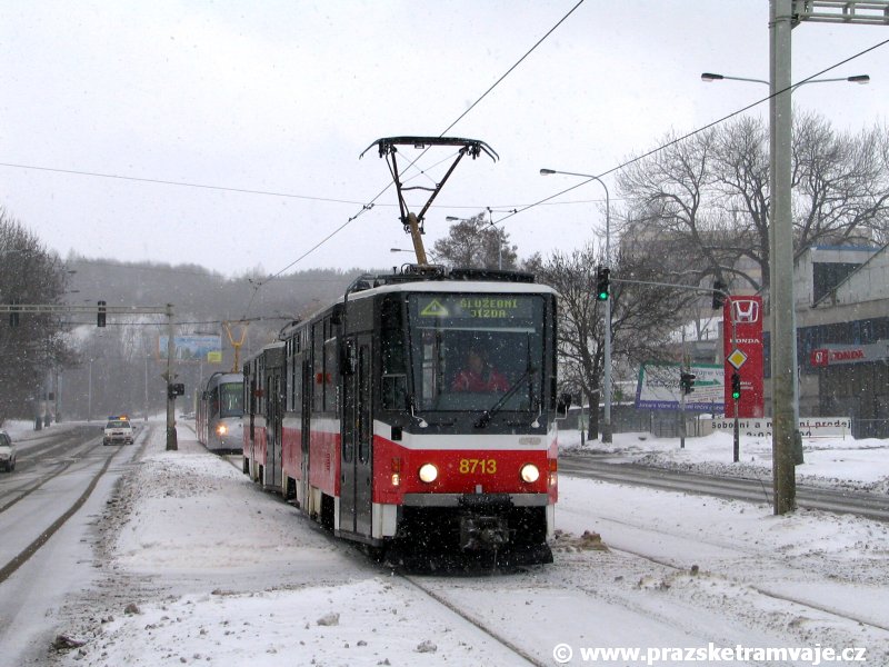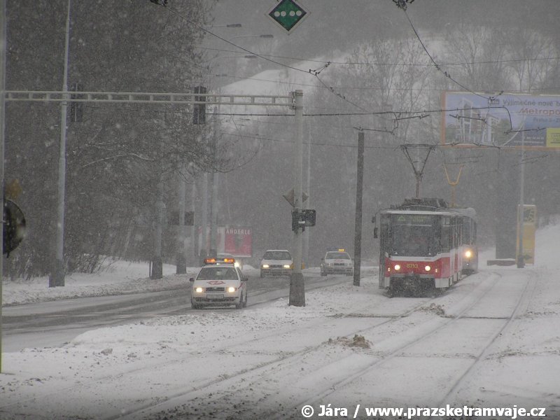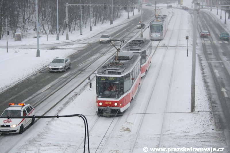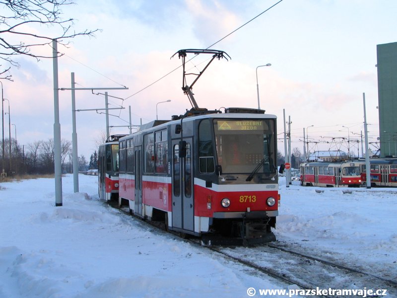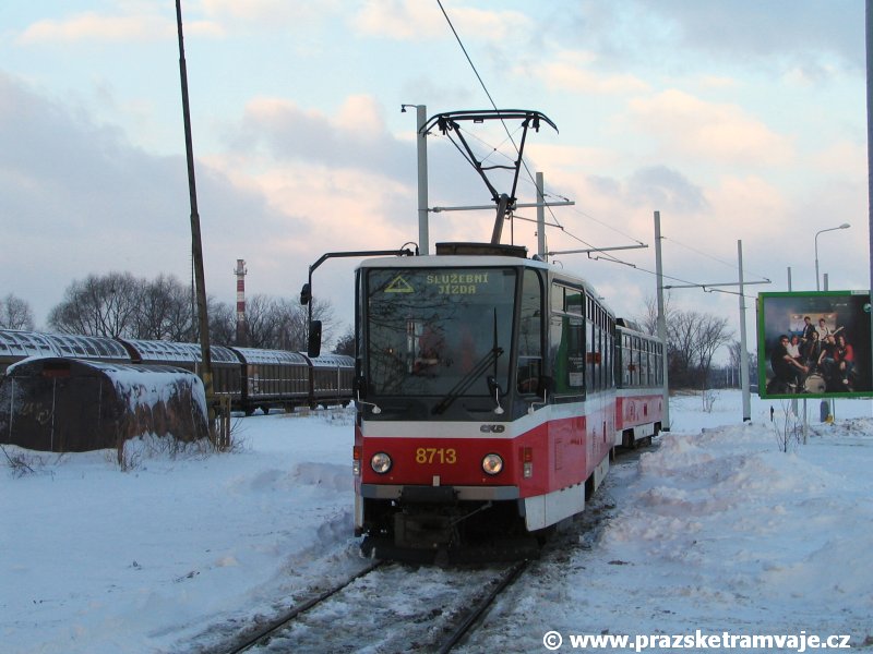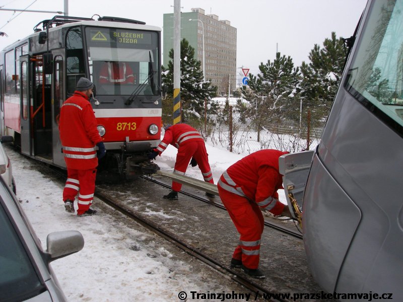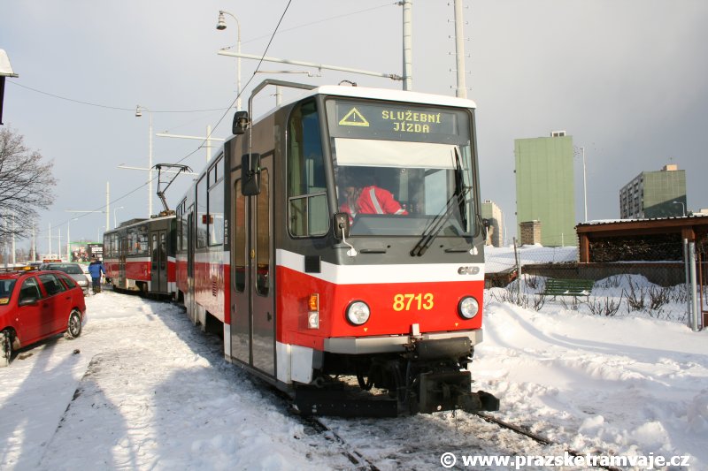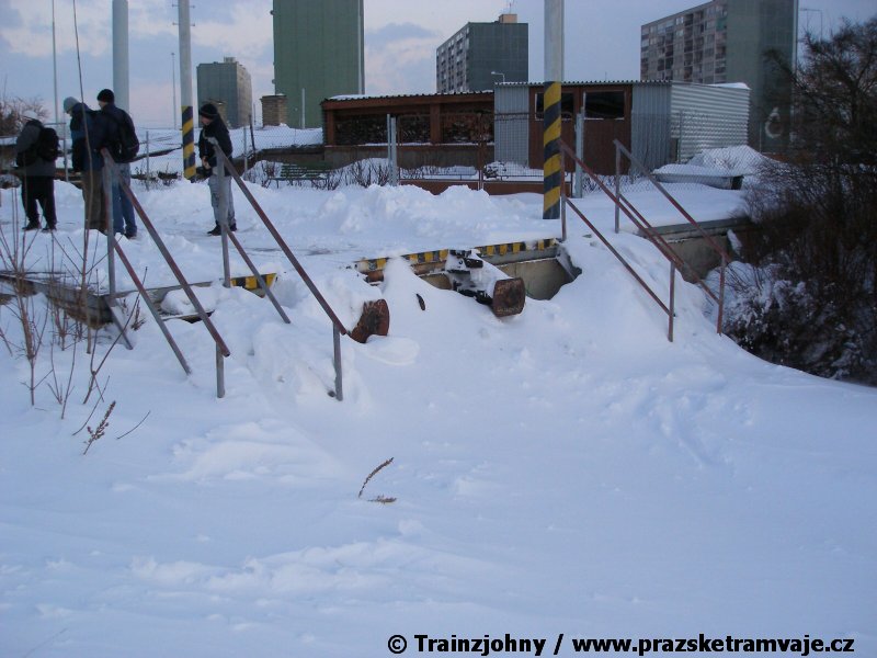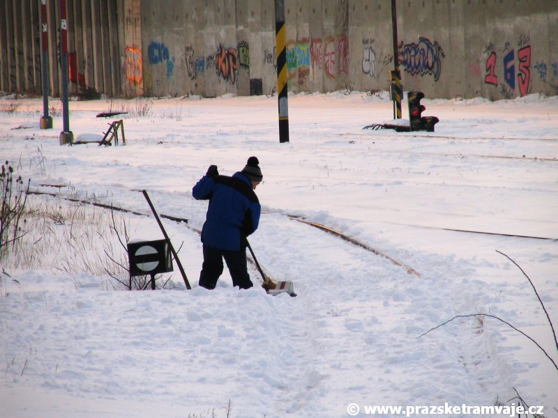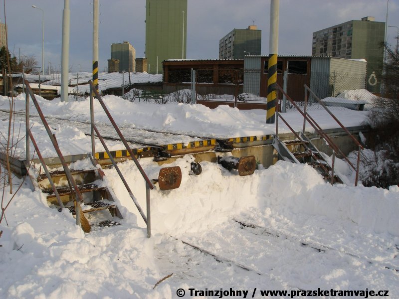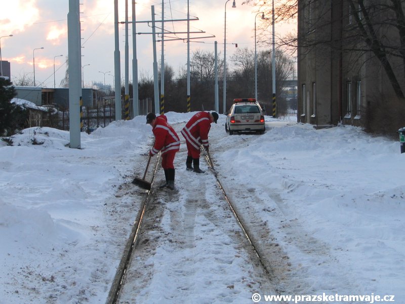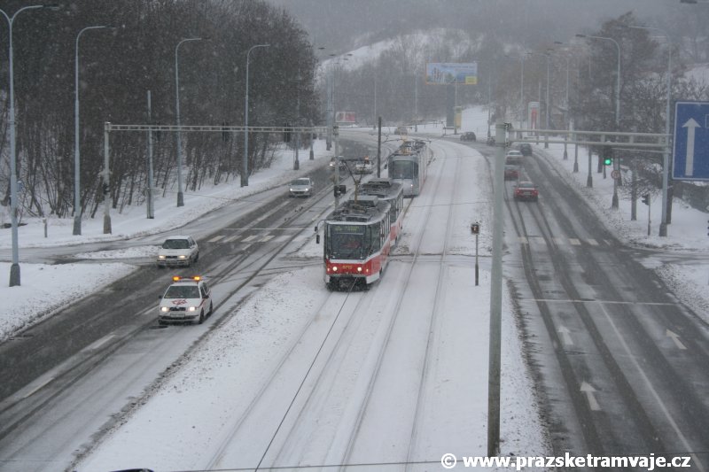 Stejně jako v předešlých případech se přeprava vozu Škoda 14T z plzeňské Škody Transportation uskutečnila po železnici v režii soukromého dopravce Viamont a.s.. Vůz budoucího ev.č.9117 byl 26.ledna 2007 ve 22:00 naložen v areálu Škody Transportation s pomocí portálových jeřábů na plošinové vozy Smmp, a ve 3:30 následujícího dne se vlaková souprava vydala do Prahy. Předávka na pražskou kolejovou síť proběhla opět na kusé předávací koleji nádraží Praha - Zličín. Bohatá sněhová nadílka vlaku zkomplikovala značně cestu, protože bylo nutné vyčkat na odstranění sněhových závějí z železniční tratě u Hostivic. Vlaková souprava složená standardně ze tří plošinových vozů typu Smmp (84 54 4633 904-1, 84 54 4633 903-7, 84 54 4633 902-5), které jsou vzájemně pevně propojeny a jejich ložné plochy uzpůsobeny pro převoz kolejových vozidel, v čele s motorovou lokomotivou 740 534-3, náležící přepravci, firmě Viamont a.s. dorazila na nádraží Praha-Zličín až krátce po půl deváté ráno. Motorová lokomotiva 740 534-3, již přivezla předchozí tramvaj Škoda 14T ev.č.9116 a úspěšně tak nahradila zapůjčenou motorovou lokomotivu 740 469-2. Zličínské nádraží sužovaly v celém kolejišti neodklízené záplavy sněhu, jehož výšku ještě umocnil vítr, který jej navál k čelu rampy předávací koleje. Již v pátek 26. ledna 2007 byli na kusou předávací kolej vysláni pracovníci vrchní stavby Dopravního podniku Praha, aby kolej připravili na dnešní akci. Z kolejiště Českých drah bohužel nikdo sníh neodstranil, proto pracovníci firmy Viamont, a.s. po příjezdu vlaku vyrazili vstříc sněhové nadílce s hrábly a košťaty, aby odstranili sníh z výkolejky, výhybky i okolí předávací koleje a zajistili tak bezpečné složení vozu. Na místě byli opět i pracovníci vrchní stavby Dopravního podniku, kteří dočišťovali od předchozího dne opět zasněženou kusou předávací kolej. Po dvaceti minutách od příjezdu na nádraží Praha-Zličín lokomotiva 740 534-3 posunula naloženou tramvaj Škoda 14T ev.č.9117 k rampě kusé předávací koleje, kde proběhlo ukotvení vagónů k rampě. Již v 8:15 dorazila na místo souprava vozů T6A5 ev.č.8713+8714, určená k vytažení vozu. Po oživení a vyzkoušení funkce kolejnicové brzdy nové tramvaje (ještě na železničních vozech) započalo v 9:45 její vytahování. Samotný přesun vozu Škoda 14T na pražské koleje byl opět dílem okamžiku. Při následném pokusu o oživení vozu se však nedařilo elektricky zdvihnout pantograf do pracovní polohy na trolej, pokusy o nouzové mechanické zdvižení také nedopadly úspěšně. Bylo proto nutné vypnout napájení troleje na kusé předávací koleji a pracovník Škody Transportation s pomocí skládacího žebříku vylezl na střechu vozu, kde přimrzlý pantograf mechanicky uvolnil. V 10:05 se vůz vlastní silou přesunul na vnější kolej smyčky Sídliště Řepy a v cca 10:15 se za hustého sněžení přepravil vlastní silou do domovské motolské vozovny. Skládání nových vozů Škoda 14T na pražské koleje pokaždé přináší něco nového, takže doufejme, že ani příjezd vozu ev.č.9118 nebude výjimkou a Pražské tramvaje nabídnou svým čtenářům opět sadu zajímavých fotografií. |