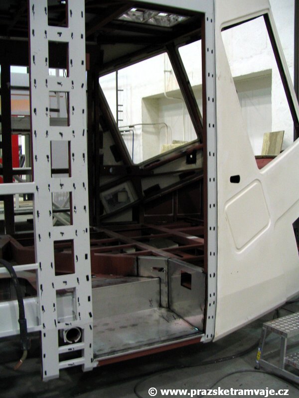 druhý článek a třetí článek těsně po nalepení bočních plechů. Z obrázku čelního článku třetí tramvaje 16T je patrné, že si polská strana objednala vozy se zmenšenou kabinou řidiče a předními