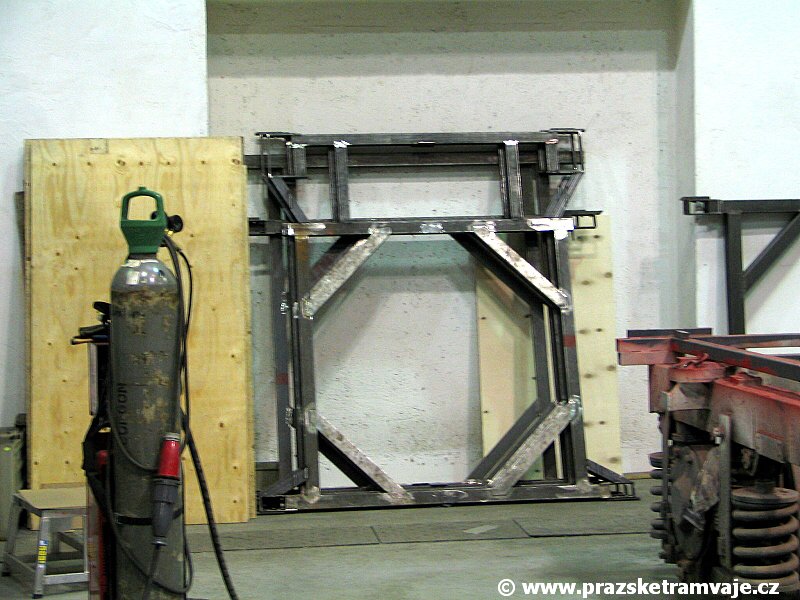 částí skeletu. Následně se k tomuto prvku postupně připevňují jednotlivé části kostry bočnice a střecha. Po jejich svaření do jediného celku se pomocné úhelníky odstraní, aby mohly být využity