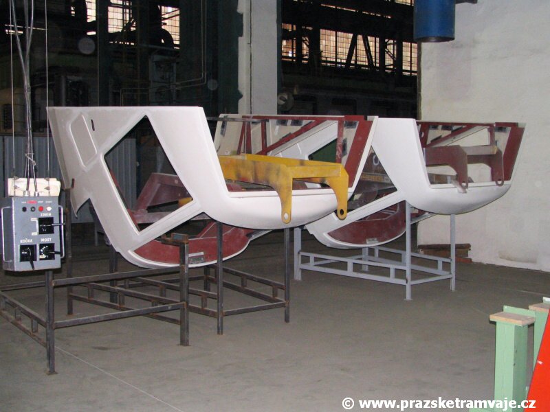 Skelety na obrázcích patří převážně rodící se třetí a čtvrté tramvaji Škoda 16T. Zaujme nás zejména čelní článek těsně po navaření kostry a instalaci laminátového čela, dále rozpracovaný nesený