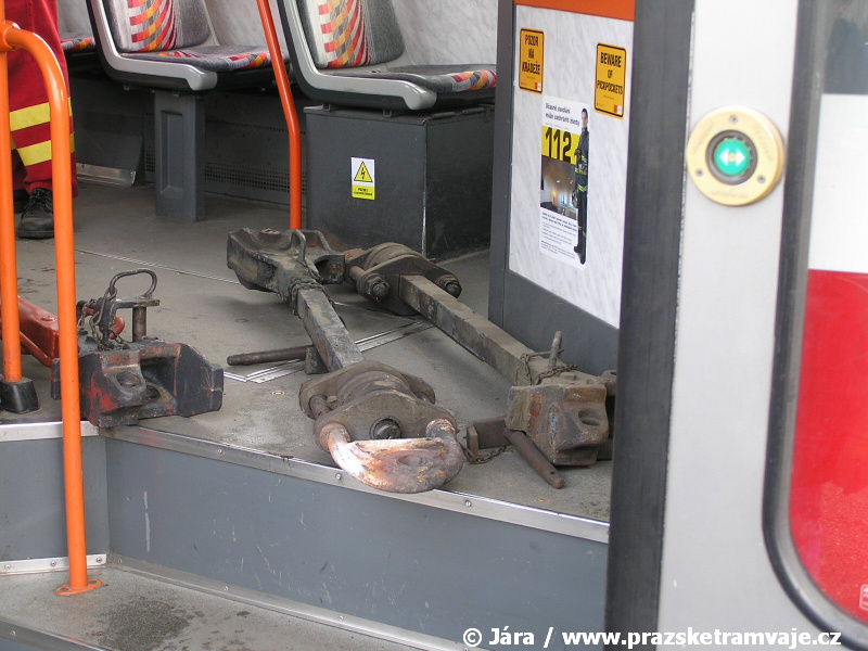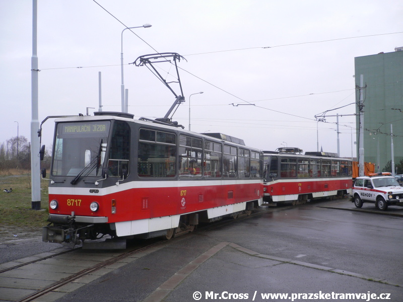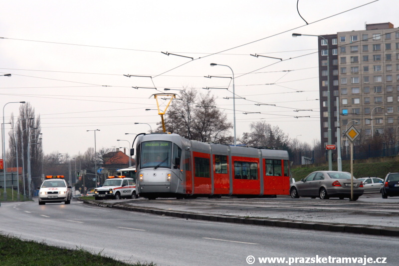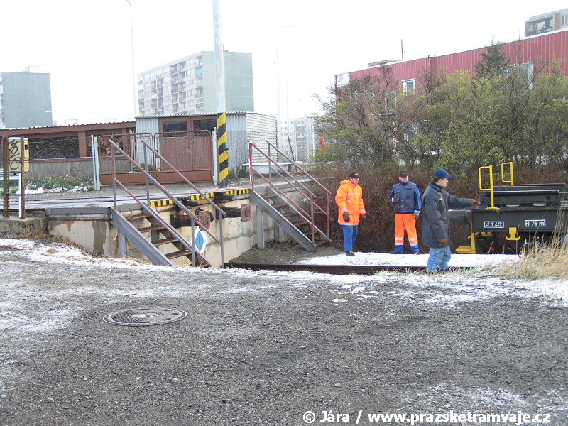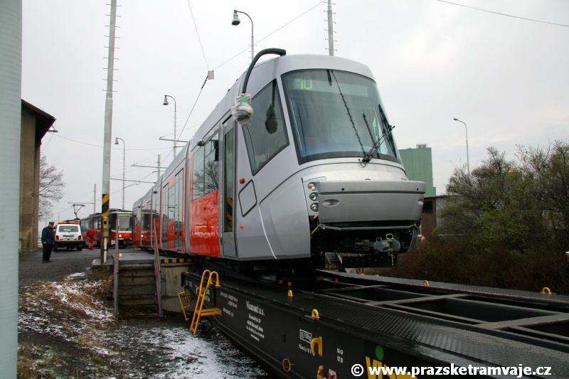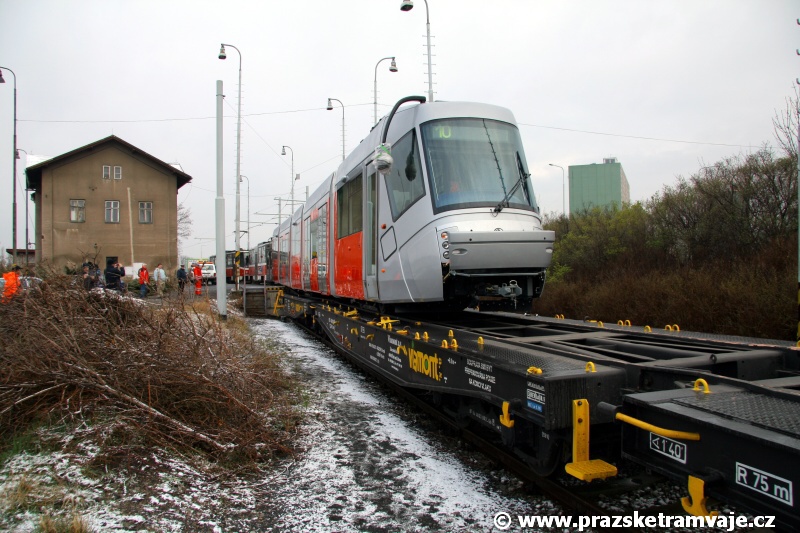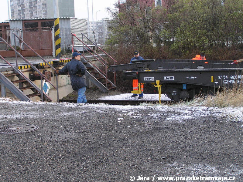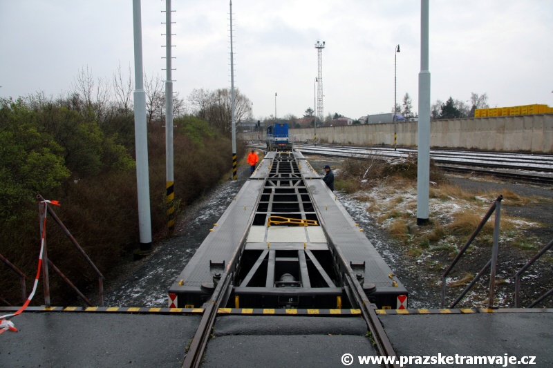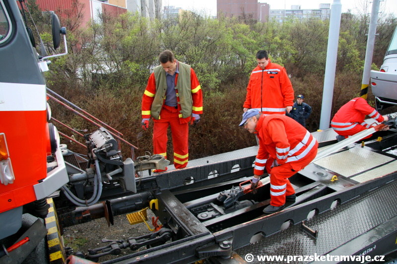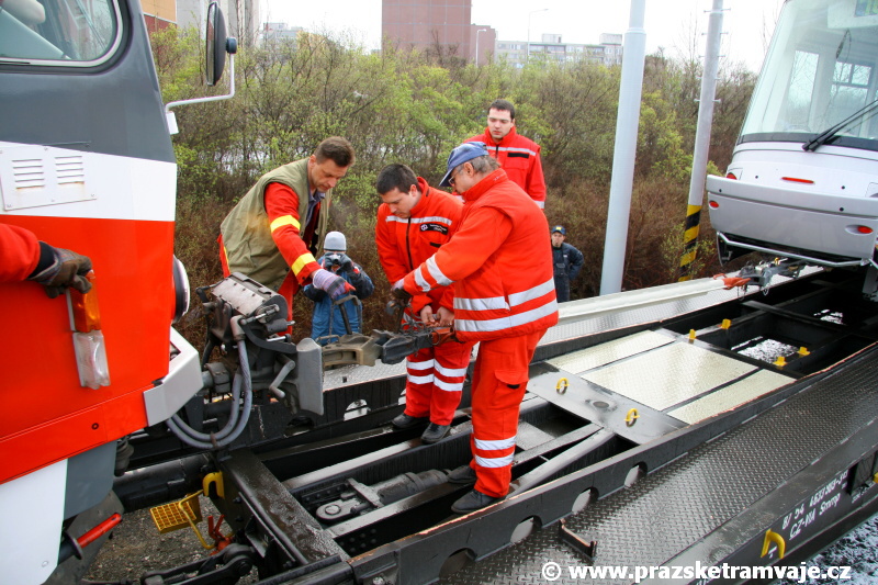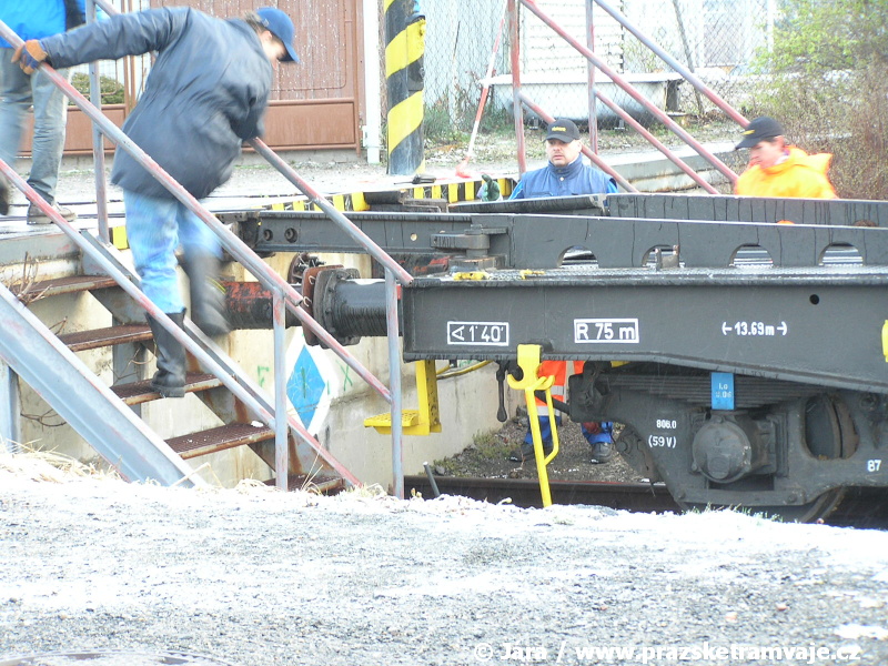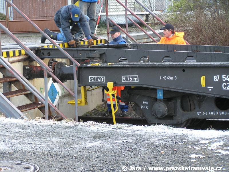 Skládání tramvaje Škoda 14T ev.č.9113 na pražské koleje 30.10.2006