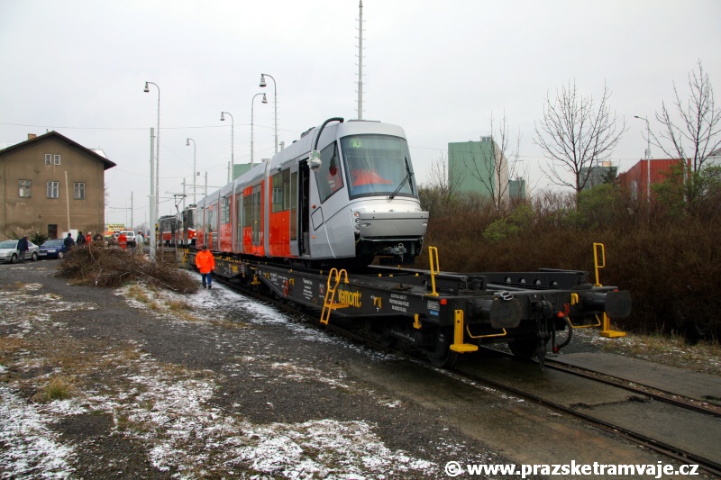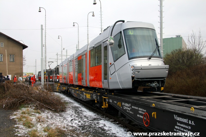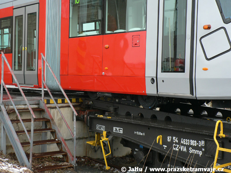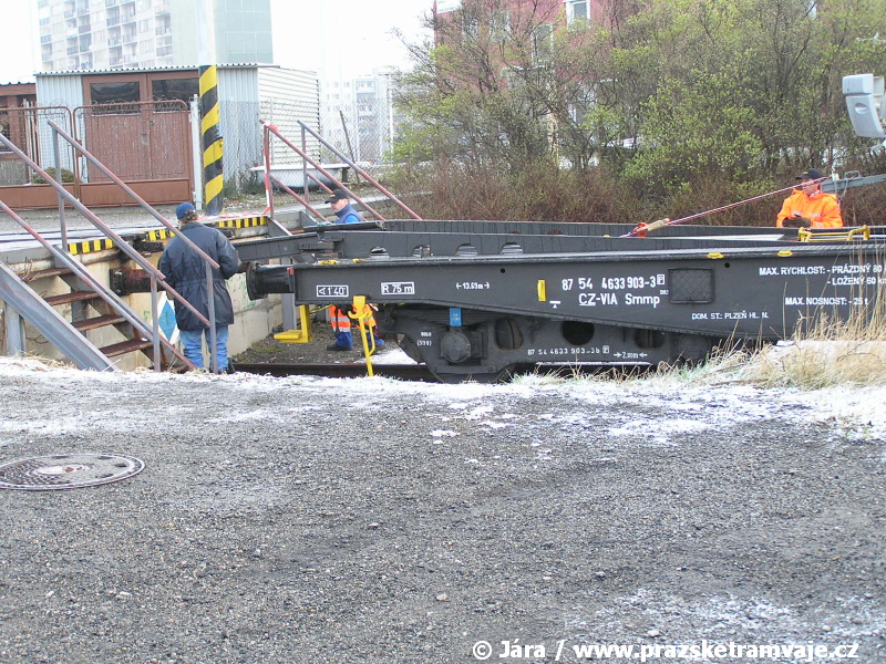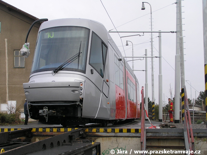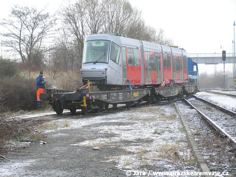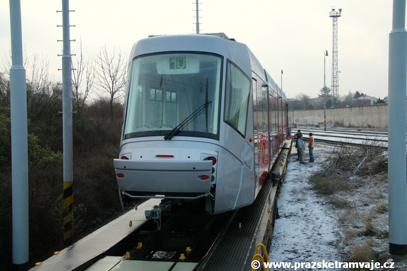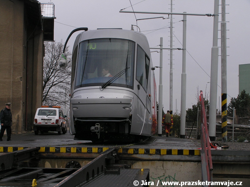 Skládání tramvaje Škoda 14T ev.č.9120 na pražské koleje 22.2.2007