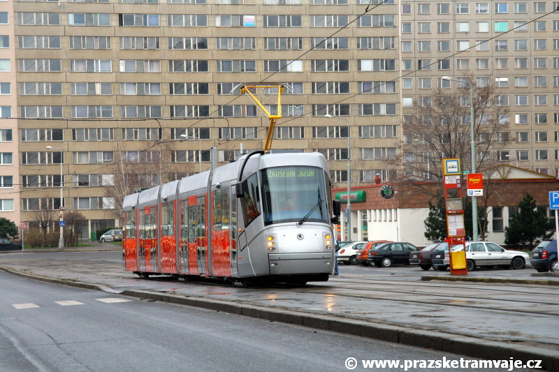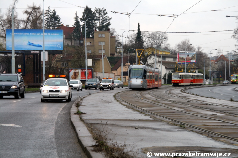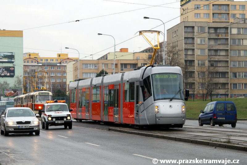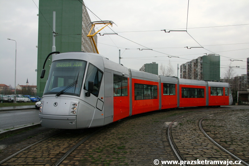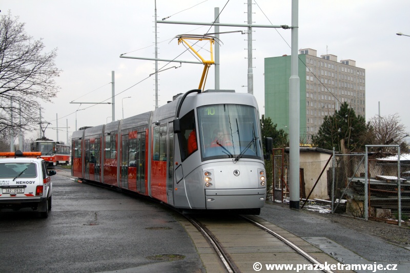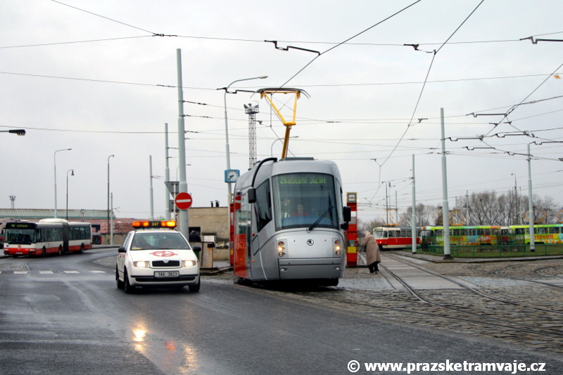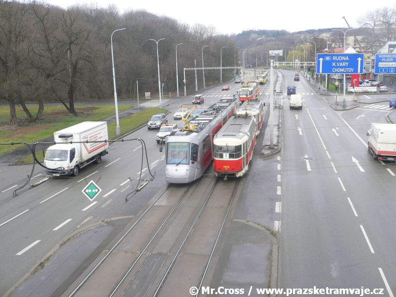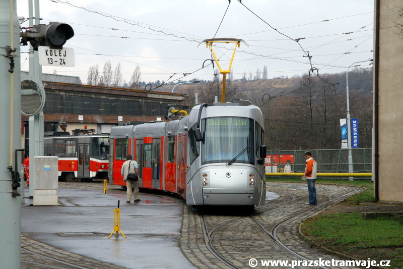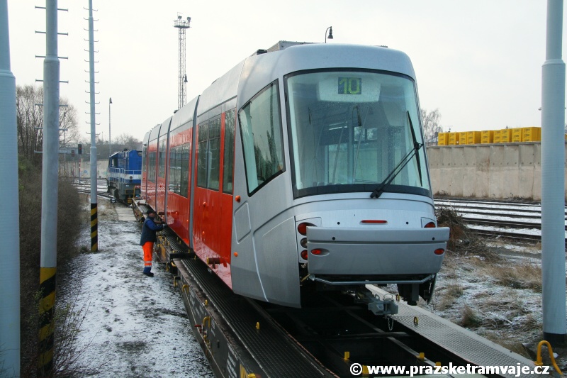 Skládání tramvaje Škoda 14T ev.č.9120 na pražské koleje 22.2.2007