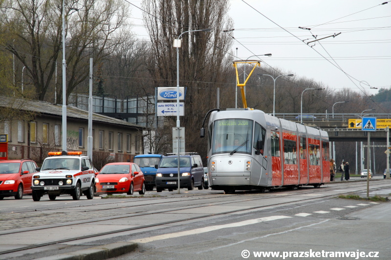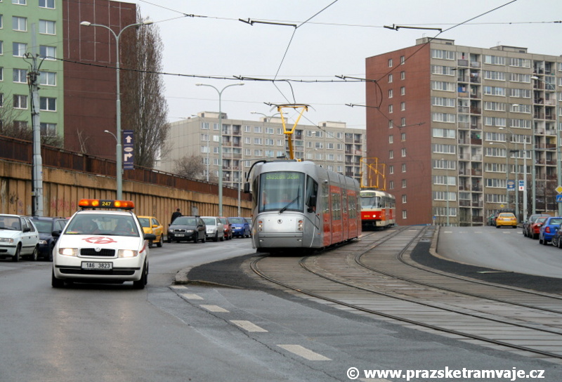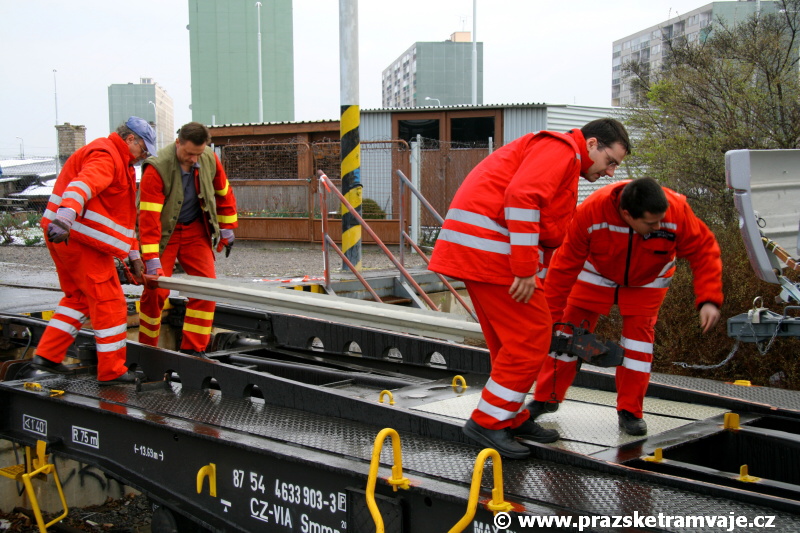 Skládání tramvaje Škoda 14T ev.č.9121 na pražské koleje 5.3.2007