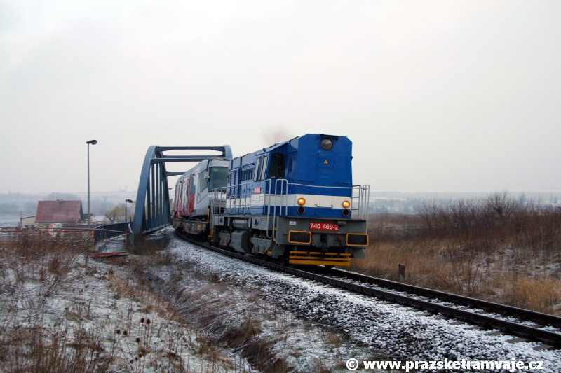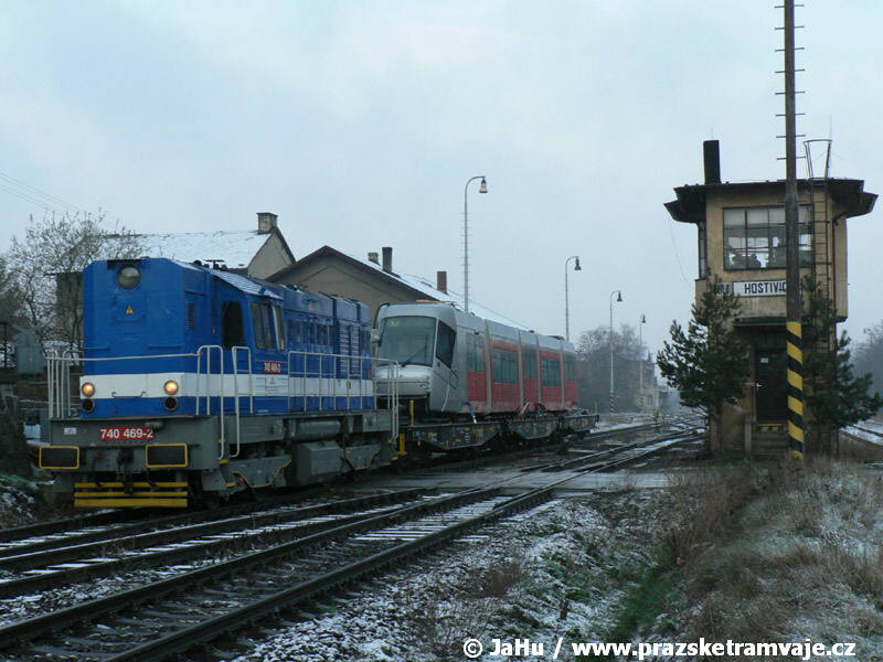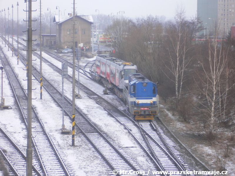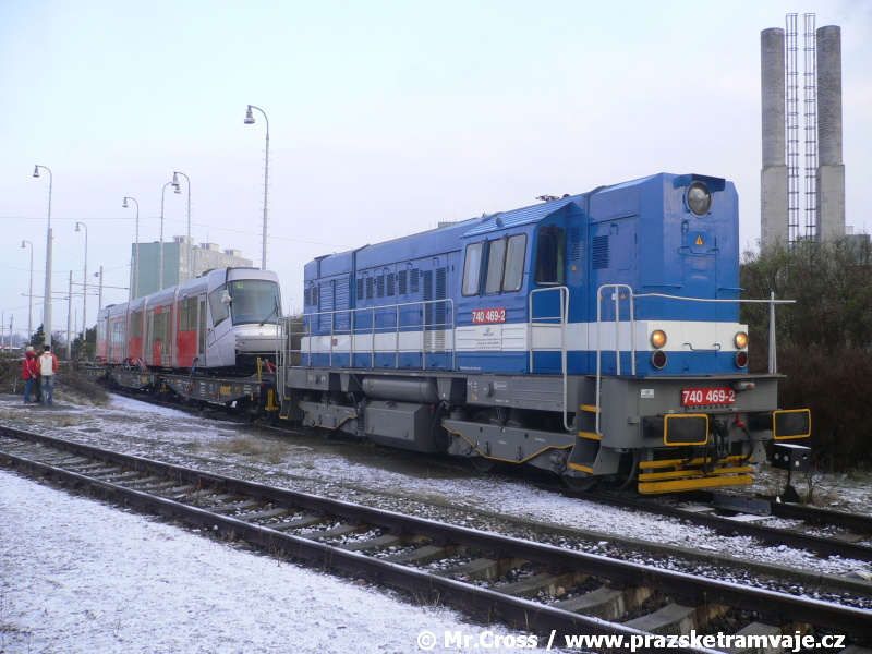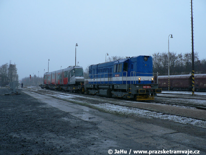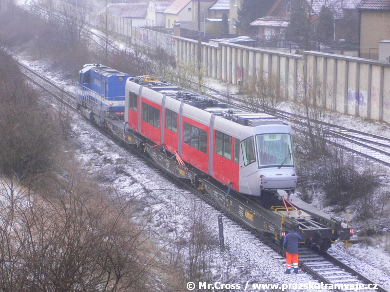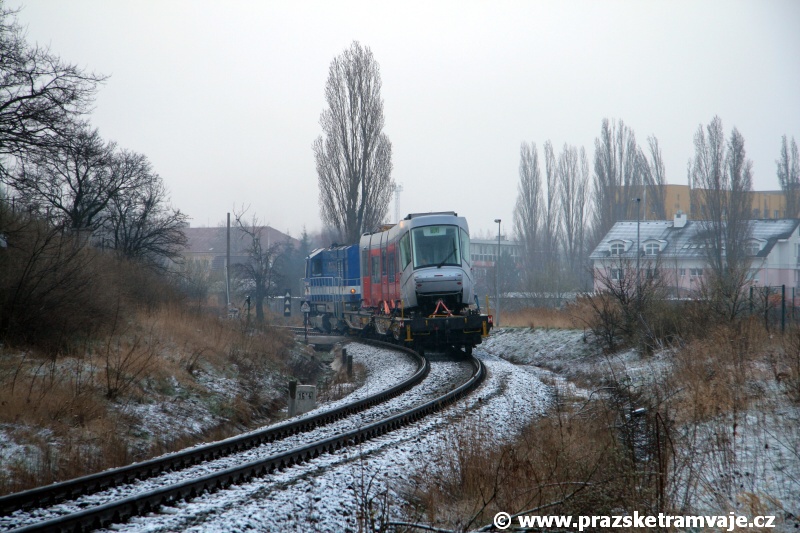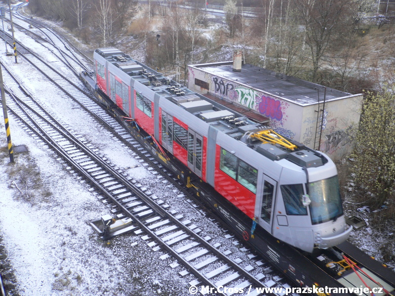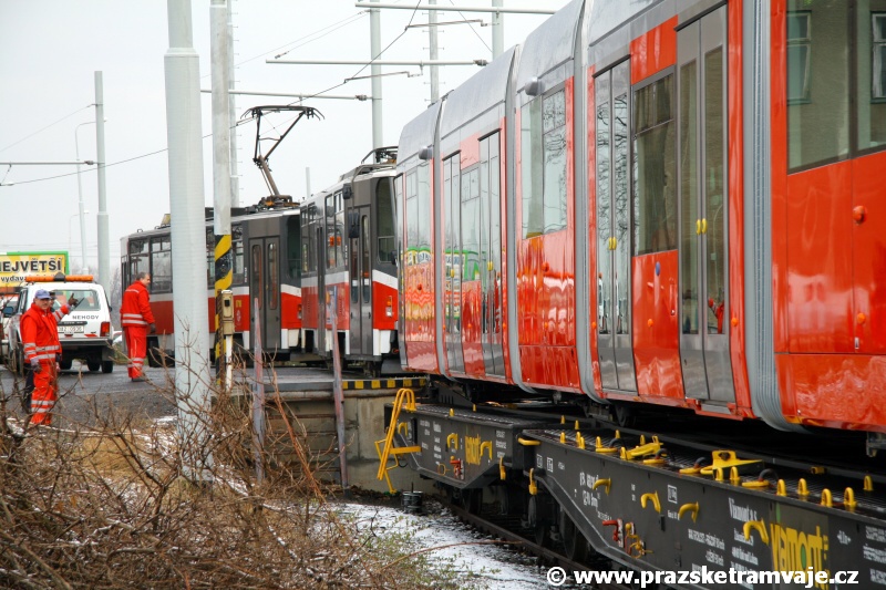 Skládání tramvaje Škoda 14T ev.č.9119 na pražské koleje 16.2.2007