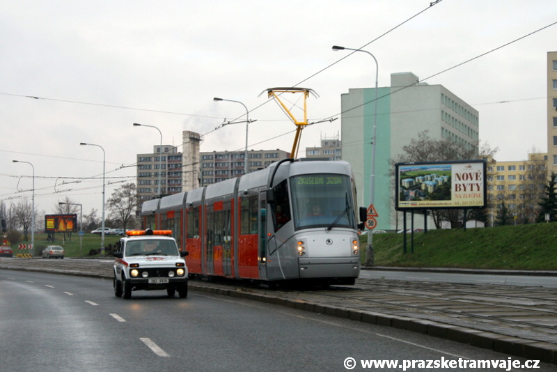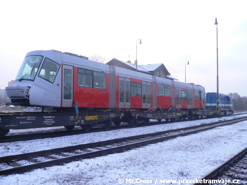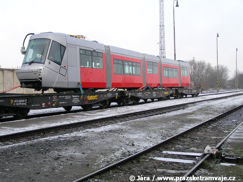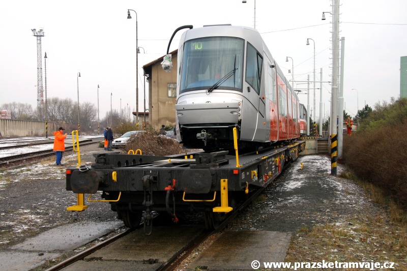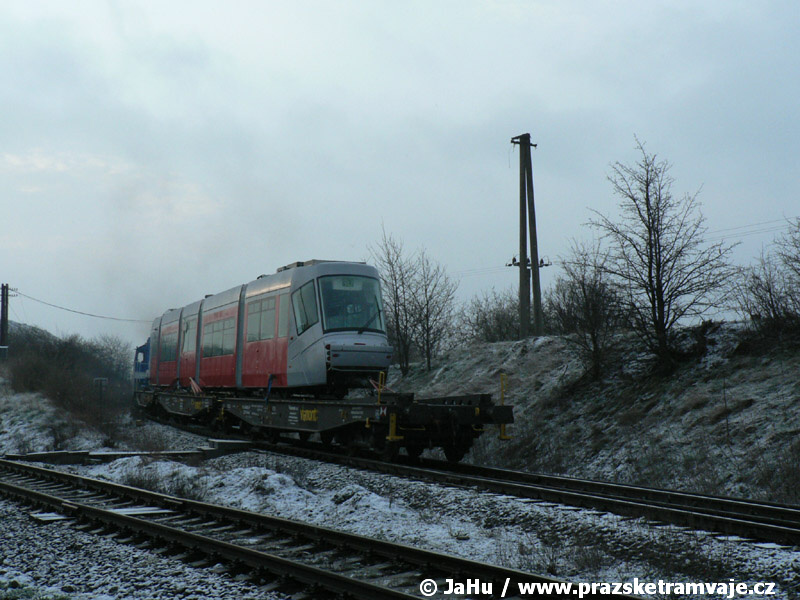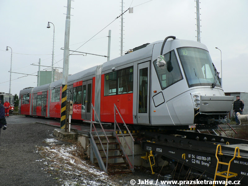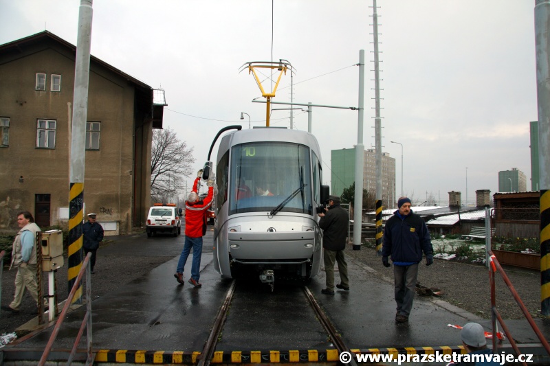 Skládání tramvaje Škoda 14T ev.č.9111 na pražské koleje 11.12.2005