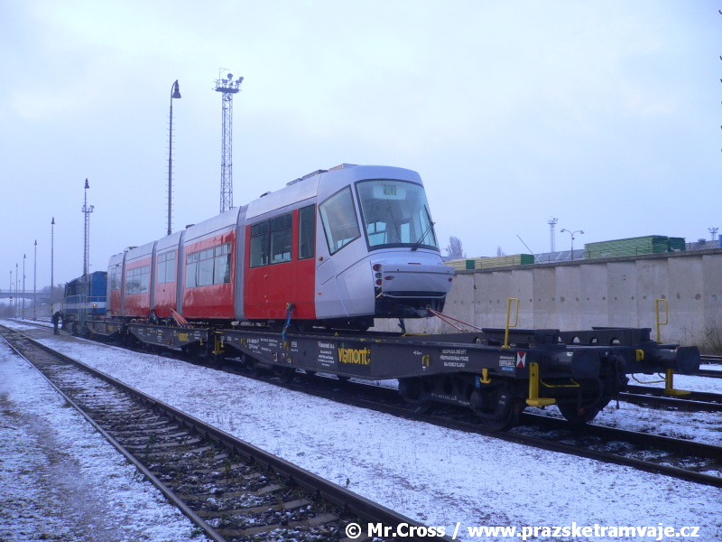 Skládání tramvaje Škoda 14T ev.č.9115 na pražské koleje 28.12.2006