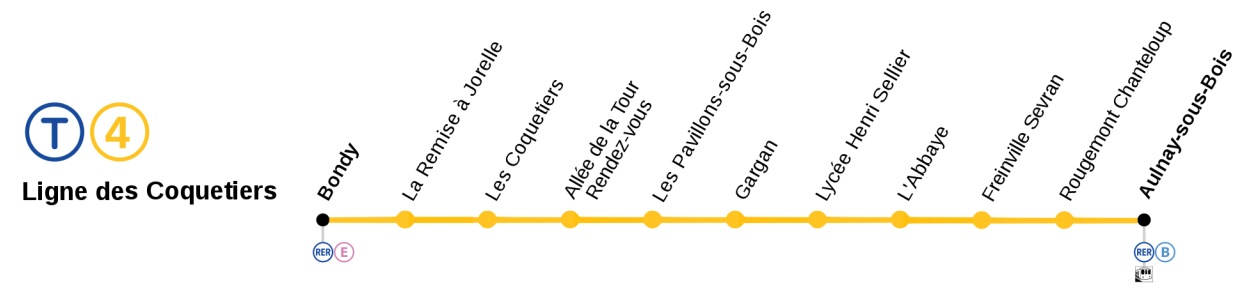 Trasa linky T4 je vedena ze stanice příměstské železnice Bondy (linka RER E, hlavní trať SNCF Paris-Strasbourg) do stanice Aulnay-sous-Bois (linka RER B, trať SNCF Paris- Soissons) a vede převážně lokalitou s nízkou zástavbou vyjma lokláního centra - města jménem Gargan zhruba uprostřed trasy. V trase Bondy - Gargan - Aulnay-sous-Bois byla zřízena železniční trať s rozchodem 1435 mm již v roce 1875 a později byla elektrifikována střídavou trakční soustavou 25 kV, 50 Hz. Koncem 20. století jezdila na trati příměstská železniční doprava ve špičkovém intervalu 30 minut (Aulnay-Gargan, jednokolejná trať), respektive 15 minut (Gargan-Bondy, dvoukolejná trať). Na základě zpracovaných studií bylo rozhodnuto na přelomu tisíciletí o rekonstrukci trati pro provoz lehčích vozidel s možností výrazného zkrácení intervalů. Výluka provozu s náhradní autobusovou dopravou začala na konci roku 2003.
