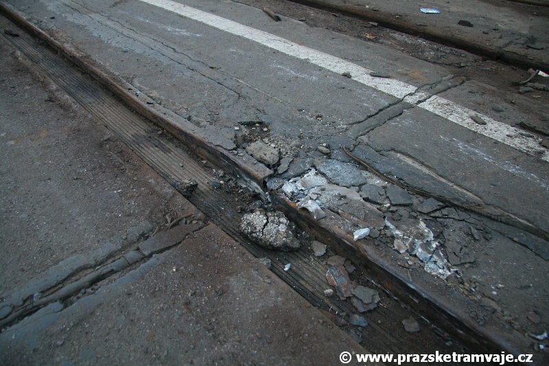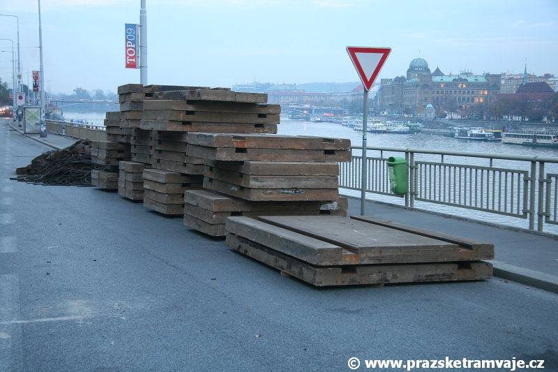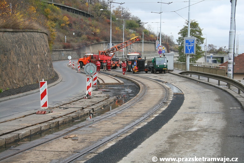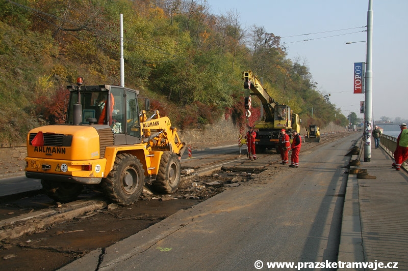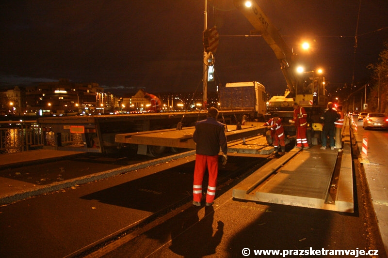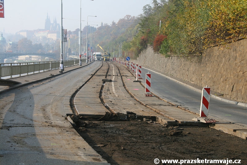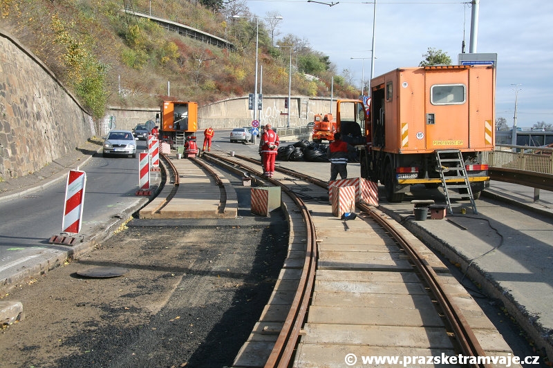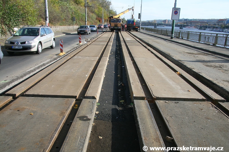 Opravovaná konstrukce tramvajové tratě na nábřeží Edvarda Beneše se nachází mezi Štefánikovým a Čechovým mostem. Konstrukce pocházela z osmdesátých let, kdy zde v roce 1982 došlo k nahrazení původní tratě na dřevěných pražcích s dodatečnou betonáží, velkoplošnými panely BKV. Ono se však o náhradu v pravém slova smyslu nejedná, ale o tom dále. Zbylé úseky z mezikřižovatkového úseku pochází z let 1991 (oblouk od Letenského tunelu) a z roku 2000 (prostor tramvajových zastávek Čechův most). Při opravě nábřežní zdi a přilehlé vozovky v roce 2007, se zde krátce naskytla možnost podívat se na archeologii tratě, skrývající mnohá tajemství. Velkoplošné panely BKV leží na přibližně 4-12 cm vysoké vrstvě živice, pod níž se ukrývá původní trať tvořená dřevenými pražci s dodatečnou betonáží. Jak bylo v 70. a 80. letech zvykem, panely se v rámci urychlení stavebních prací pokládaly přímo na původní konstrukci. Proto není překvapením, že zde místy bylo možno nalézt i zaasfaltované pozůstatky upevňovadel. Kvalita podkladní vrstvy (v podstatě se jedná o pevnou jízdní dráhu, na které jsou položeny velkoplošné panely) a příznivé sklonové i směrové poměry (opravovaná část se nachází z velké části v přímé s minimálním sklonem), zabránila některým charakteristickým poruchám např. sesedání panelů, naopak typické poruchy pro takové konstrukce se zde plně projevily. Srážková voda z povrchu vozovek neměla kam unikat, a tak se hromadila pod panely, kam se naplavovala postupně i se zeminou a ostatními nečistotami z vozovek. Následky jsou jasné - totálně se rozpadající panely a vyhnilé žlaby. Oprava tratě začala 1. listopadu 2010. V prvním dni byly upáleny, nařezány a odvezeny veškeré kolejnice, v oblouku na předpolí Štefánikova mostu bylo vytěženo i pár krátkých panelů v přilehlém oblouku. Následujícího dne dochází k postupnému těžení velkoplošných panelů BKV na přistavené návěsy. Vyndávání panelů probíhá v obou kolejích současně od začátku úseku při vyústění podjezdu Čechova mostu směrem ke Štefánikovu mostu. Některé z šestimetrových kusů jsou natolik "kvalitní", že se již po vybrání pryží a kolejnic rozpadnou na několik nesourodých částí a je nutné je vyzvedávat velice opatrně. Po odfrézování podkladní vrstvy může dojít k vyčištění tělesa a ke 4. listopadu i ke zřízení nových podkladních asfaltových vrstev. Po geodetické přípravě a zaměření polohy nově vkládaných panelů může následujícího dne začít jejich opětovná pokládka. Jelikož je v Praze snaha stavět tramvajové tratě jinými, modernějšími technologiemi, nové panely se již u výrobce neobjednávají, a tak musí na řadu přijít skladové zásoby a vyzískané panely z minulých rekonstrukcích. Letošní rok byl vhledem k délce a počtu úseků velice úrodný, a zejména panely z řepské tratě lze k opravě opakovaně využít. O víkendu 13. - 14. listopadu došlo k výměně přestavníkového mechanismu atypické neuzamykatelné radiově ovládané výhybky ev.č.111 křižovatky Čechův most na samotném mostě za uzamykatelnou s extrémně tenkou přestavníkovou skříní ev.č.566, kterou Rustonka v minulém období vyvinula. Zmizelo taktéž unikátní žluté diodové výhybkové návěstidlo (asociující čtvercové segmentové návěstidlo), které bylo nahrazeno za klasické s červenou šipkou. Po nezbytné úpravě okolních povrchů vozovek a trakčního vedení došlo k vykonání standardní zkušební jízdy vozem pracovním vozem T3 ev.č.5521 a od 17. listopadu 2010 se na trať vrací pravidelný provoz. Délka rekonstruovaného úseku je cca 1,2 km jednokolejně. Akce proběhla v režii Vrchní stavby, frézování podkladní vrstvy a položení nové živice provedla společnost Eurovia a.s.