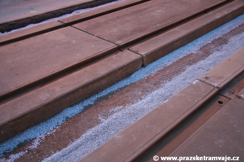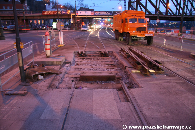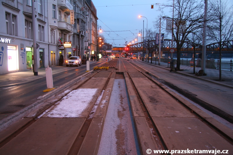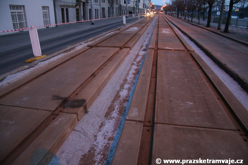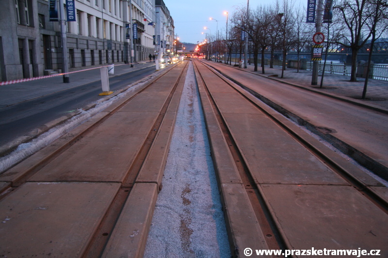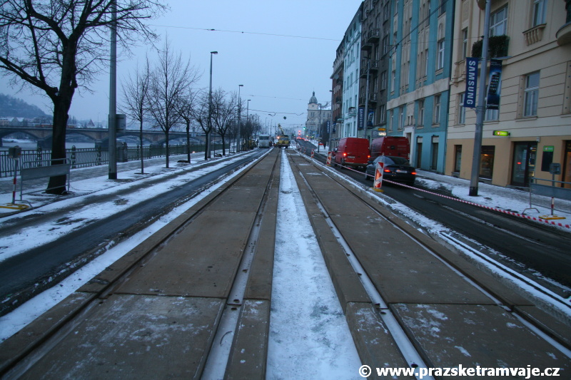 V pátek 3. února probíhá frézování podkladních vrstev. To odhaluje konstrukci původní tratě překrytou velkoplošnými panely v 70. letech 20. století – betonovou desku s podkladnicemi pro uchycení kolejnic. Klasicky v tomto okamžiku následuje položení nové živice, zaměření polohy nových panelů a jejich položení. Mrazy však nedovolují položení asfaltového koberce, proto je operativně přistoupeno k rozprostření cca 5 cm vysoké vrstvy zhutnělého štěrku na geotextilii a následné pokládce panelů. Prostor pro středové panely je vybetonován. K obnovení provozu dochází v úterý 14. února 2012. Aby bylo možné uzavřít nábřežní automobilový jízdní pruh od Palackého náměstí k Výtoni, došlo k netradičnímu řešení odklonu dopravy v tomto směru. Automobily byly odkloněny na náplavku. Výluky se využilo také k vyjmutí dilatačních styků v zastávkách Palackého náměstí a výměně sjezdové výhybky s výměnnými jazyky na Výtoni za modernější konstrukci. Akce byla hrazena z interních zdrojů.