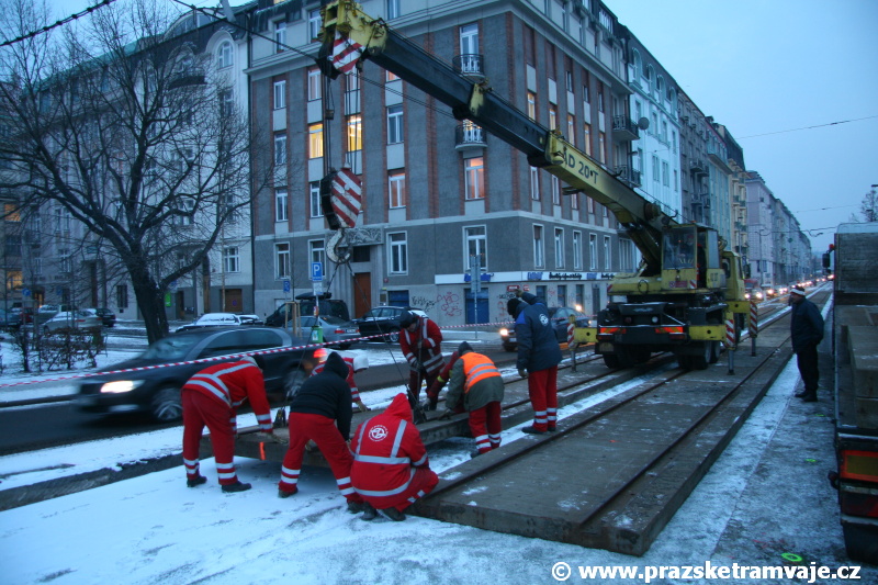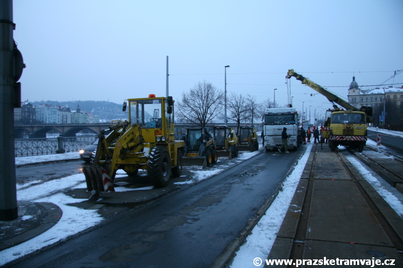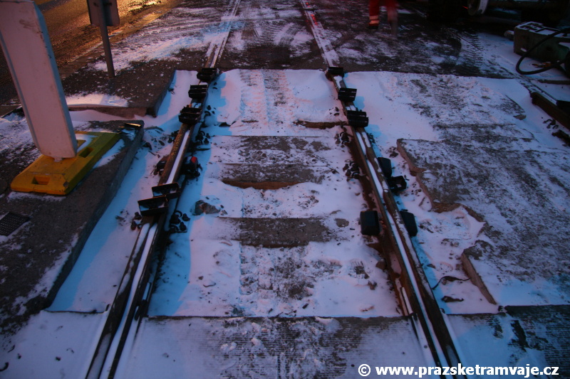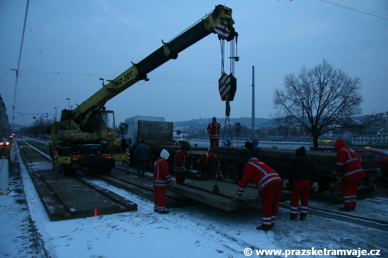 Ani třeskuté mrazy vládnoucí Praze nezabránily tomu, aby vrchní stavba prováděla opravné práce na tramvajových tratích.