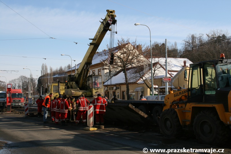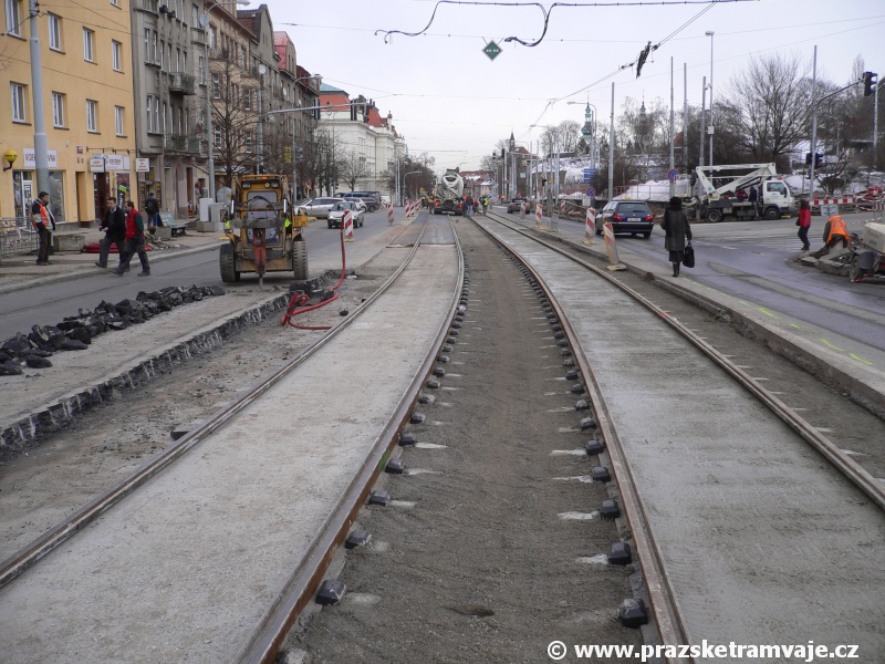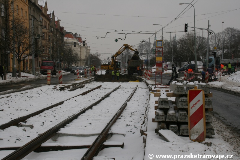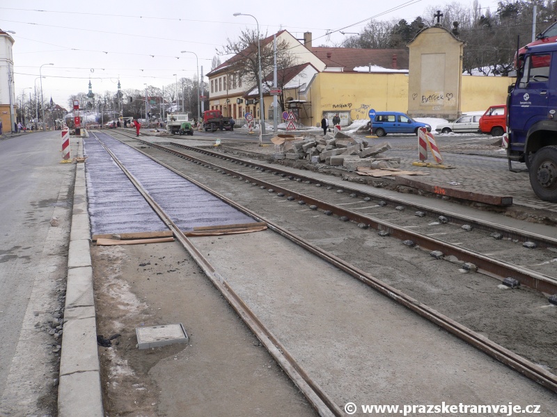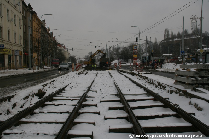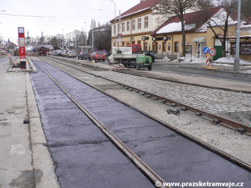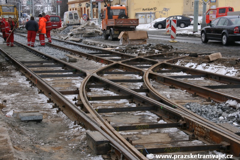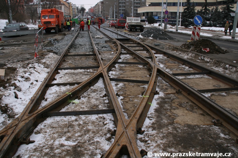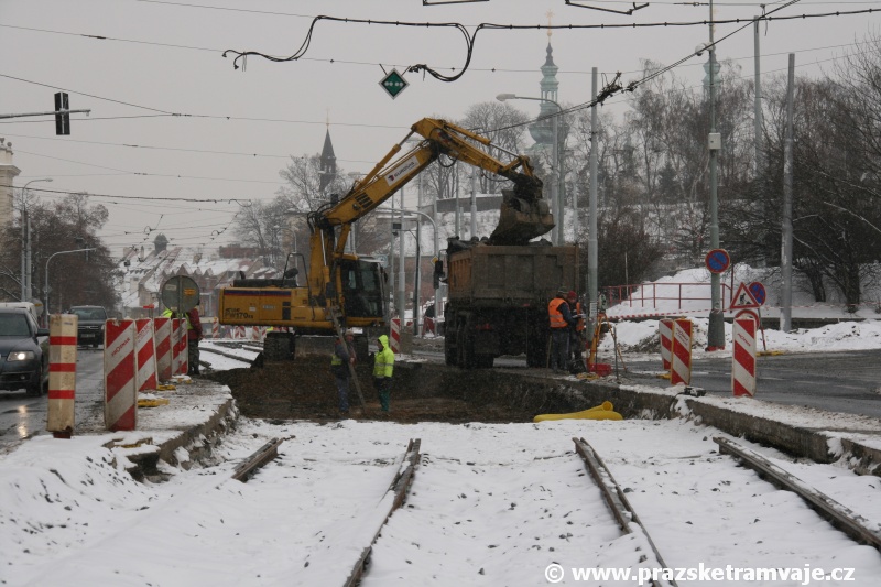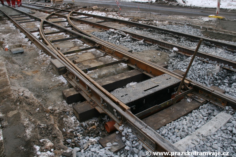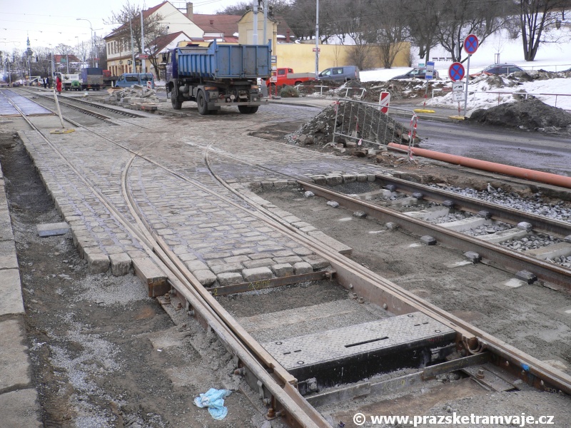 Dne 9.února 2010 pracuje vrchní stavba na očišťování panelů VÚIS, na kterých leží výjezdová konstrukce smyčky Královka a vrcholí přípravy na kladení nové konstrukce. Koncový úsek před křižovatkou s ulicí Pod Královkou připomíná zatím spíše skládku stavebního materiálu, nachází se zde totiž vybouraná betonová deska původního podkladu. Přestože napadne další porce sněhu, leží již 12. února nová křižovatková konstrukce upevněna na svém místě.