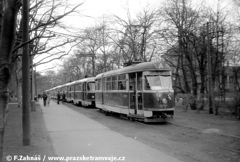 přejíždělo, byla linka A obsazena jedním sólo vozem T1 (přejezd z linky 14), 3 sólo vozy T3 (přejezdy z linek 10 a 24) a 11 vlaky 2xT3