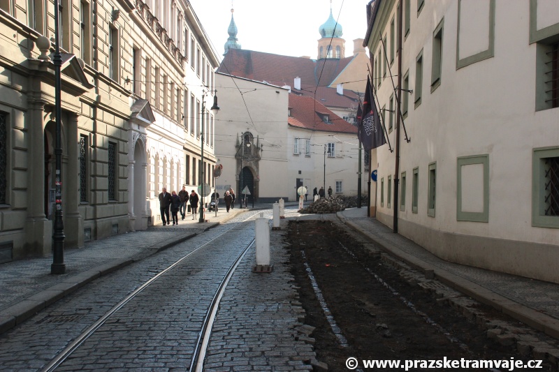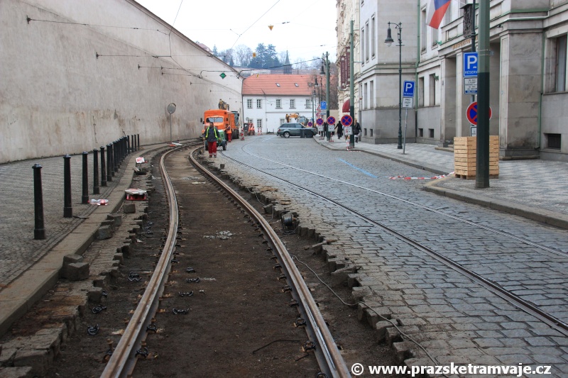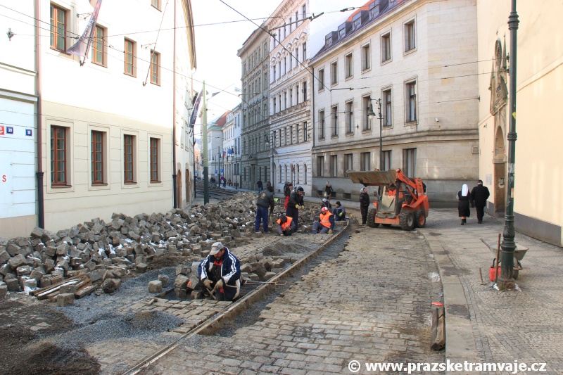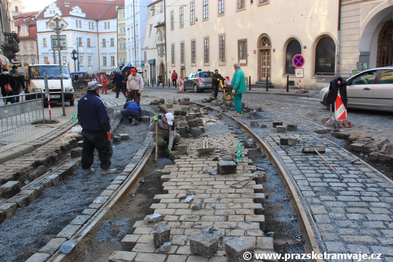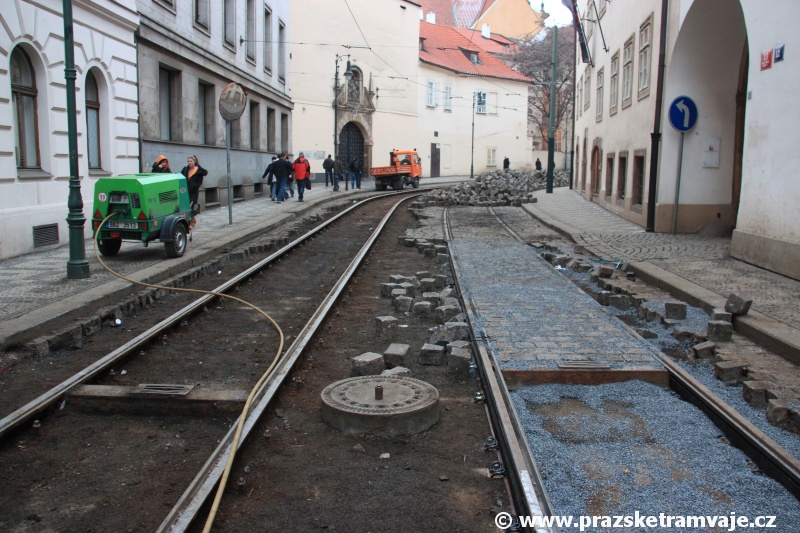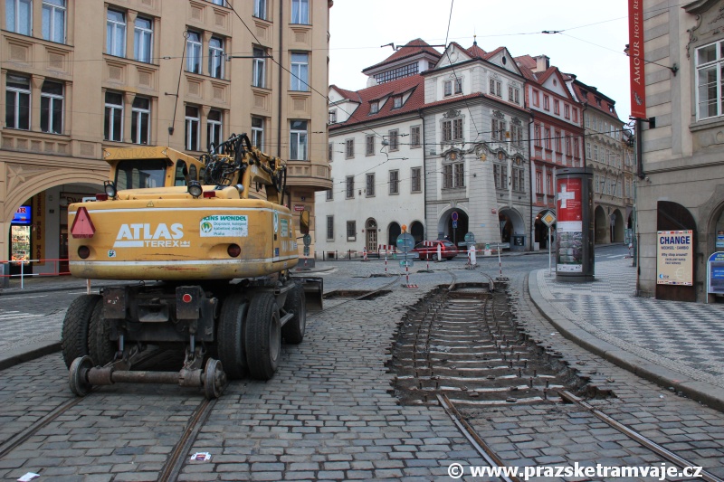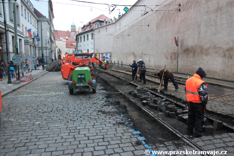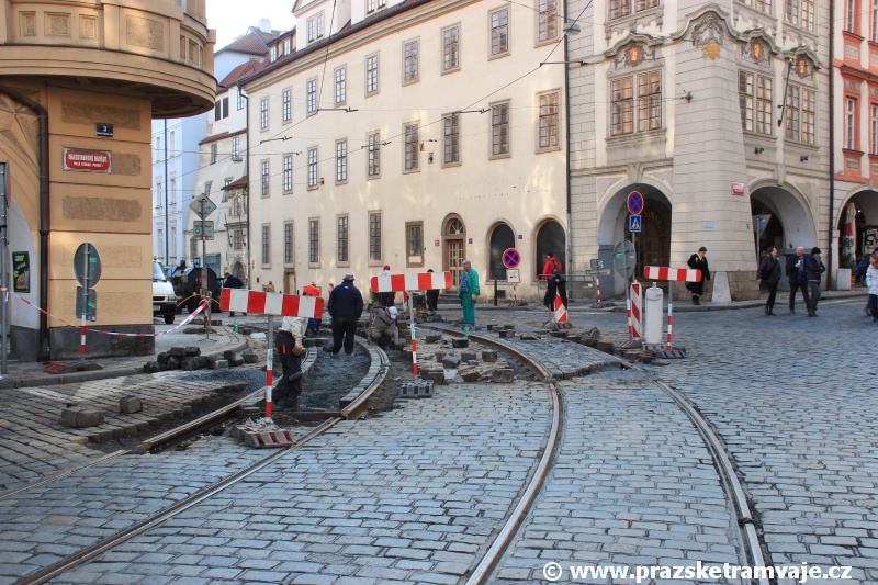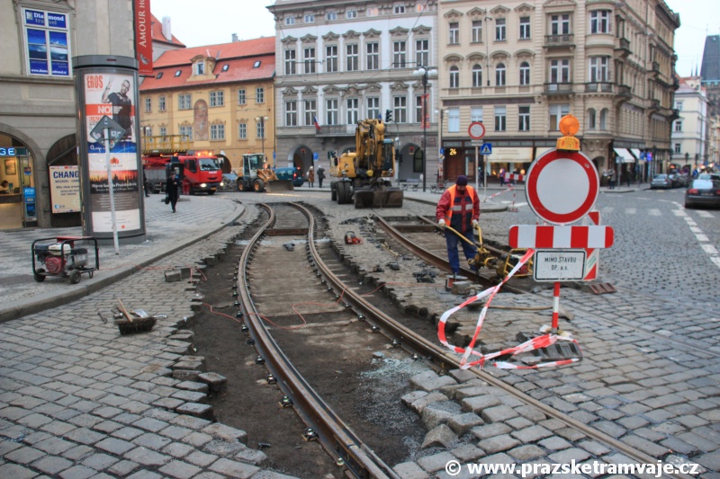 Stalo se již dobrou tradicí vyměnovat jeden vrchol kolejového trojúhelníku za víkend a nebylo tomu jinak i při této akci, kdy v neděli večer byla již kolejová konstrukce kompletně na místě a výluku připomínal pouze místy nedokončený zákryt ze žulové dlažby. Důvod pro tento nedodělek je prostý. Současně se totiž měnily kolejnice v esíčku u zastávky Malostranské náměstí, které bylo nutno co nejrychleji zadláždit, aby zde mohla od úterý projíždět náhradní doprava X22, včetně midibusové linky 292, takže dlaždiči byli prioritně vysláni sem.