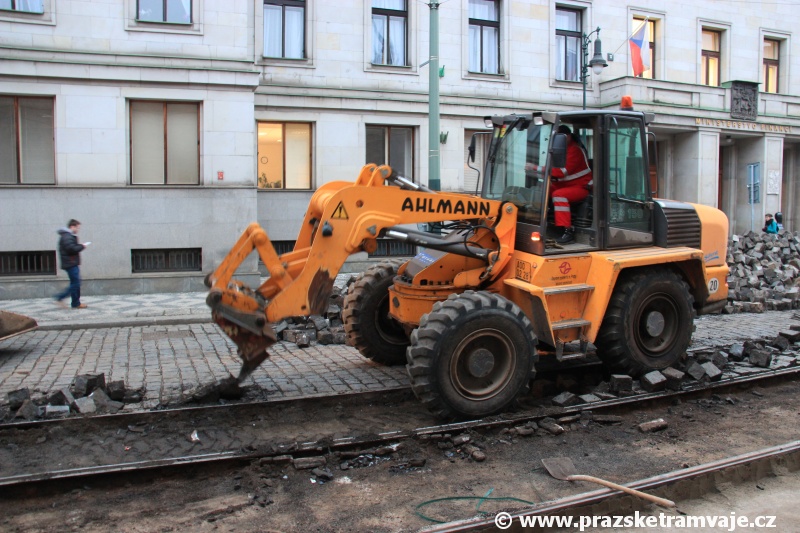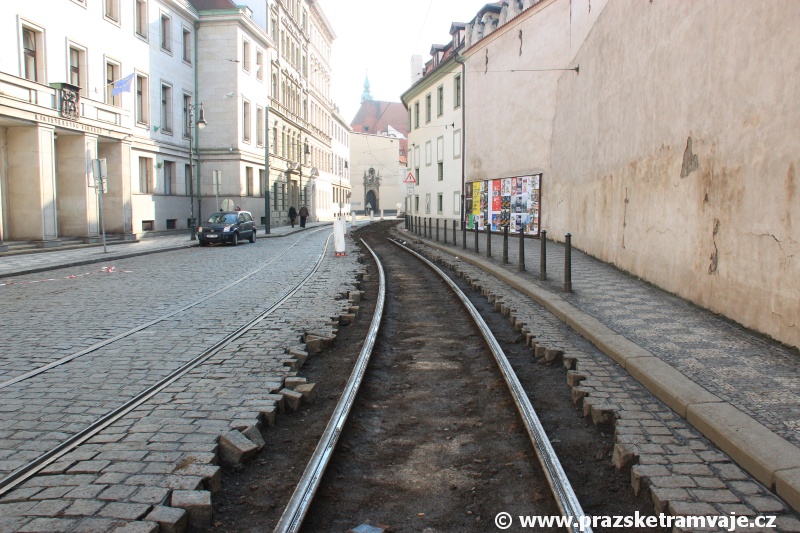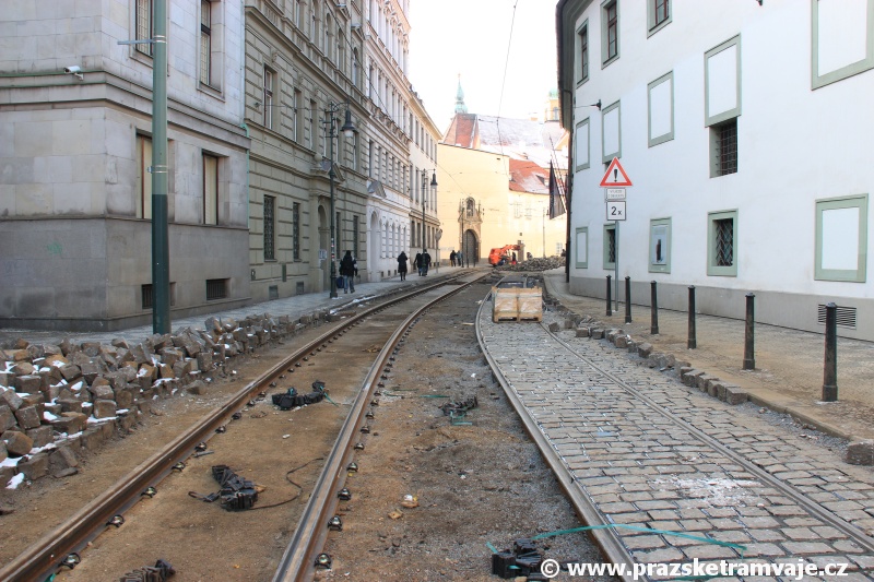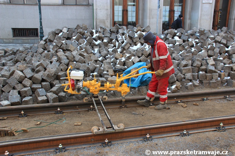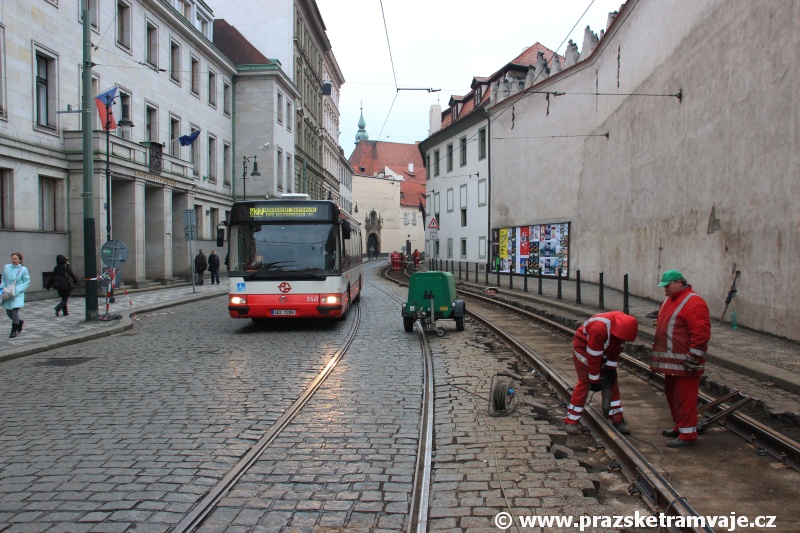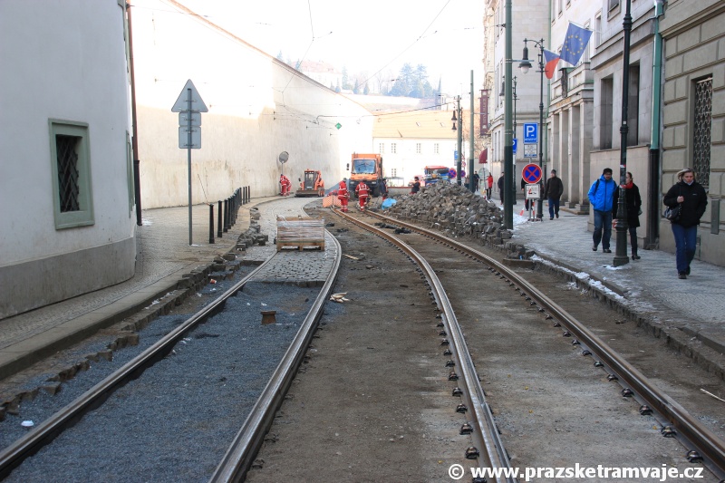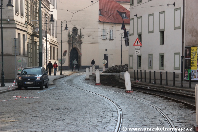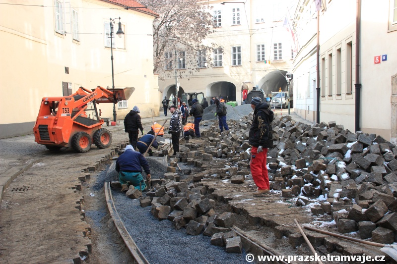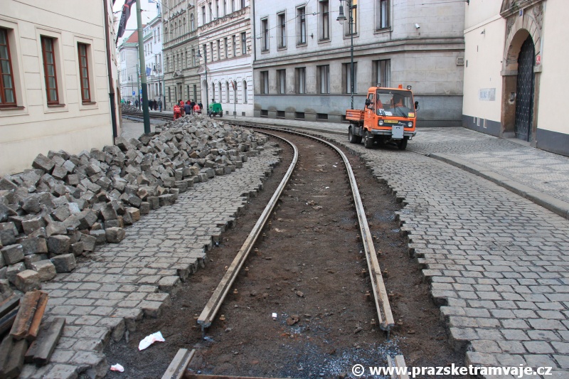 Stalo se již dobrou tradicí vyměnovat jeden vrchol kolejového trojúhelníku za víkend a nebylo tomu jinak i při této akci, kdy v neděli večer byla již kolejová konstrukce kompletně na místě a výluku připomínal pouze místy nedokončený zákryt ze žulové dlažby. Důvod pro tento nedodělek je prostý. Současně se totiž měnily kolejnice v esíčku u zastávky Malostranské náměstí, které bylo nutno co nejrychleji zadláždit, aby zde mohla od úterý projíždět náhradní doprava X22, včetně midibusové linky 292, takže dlaždiči byli prioritně vysláni sem.