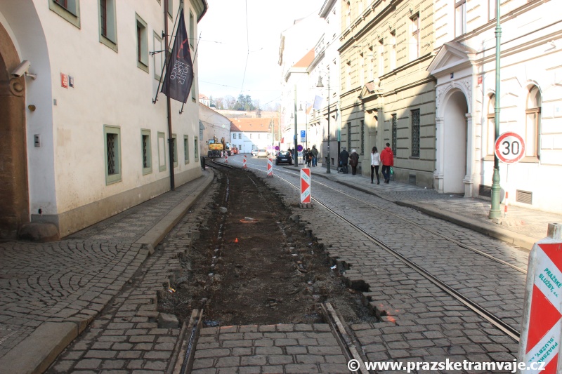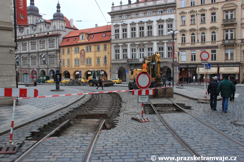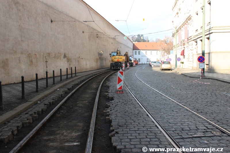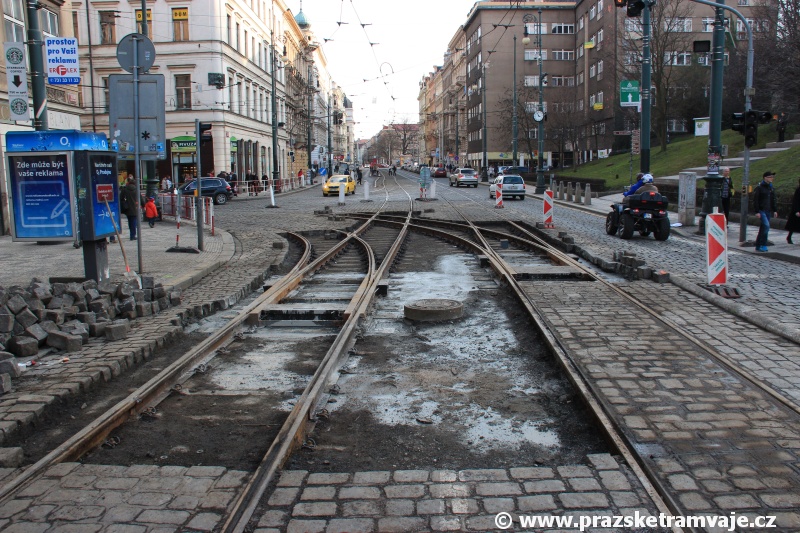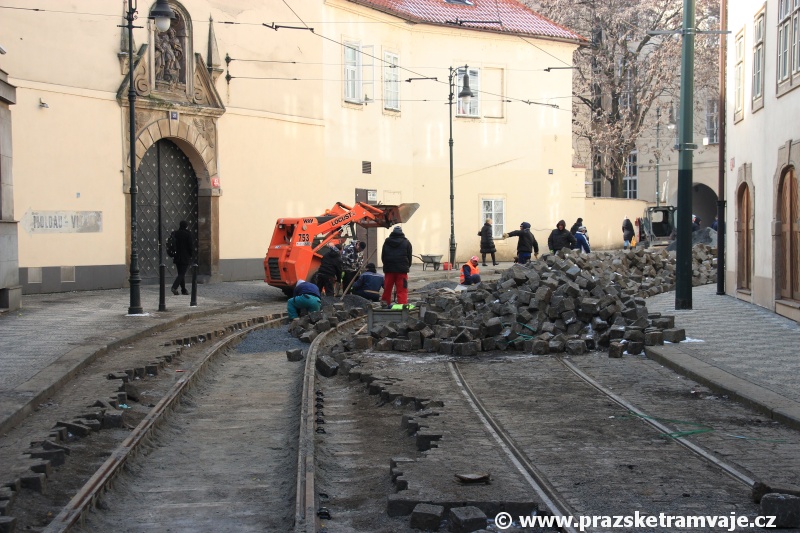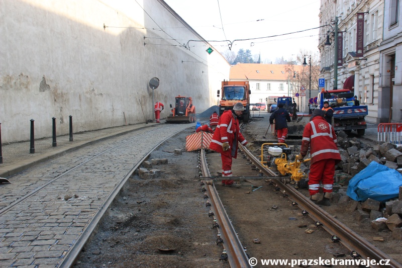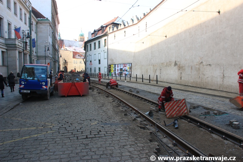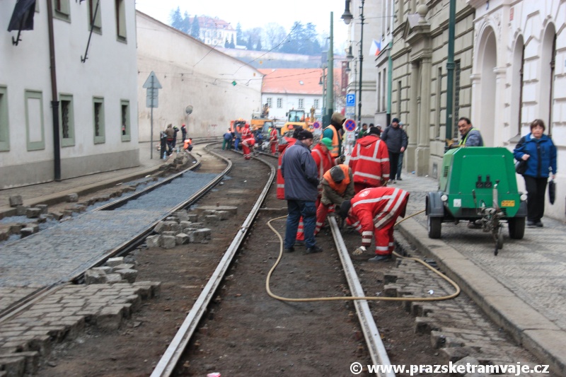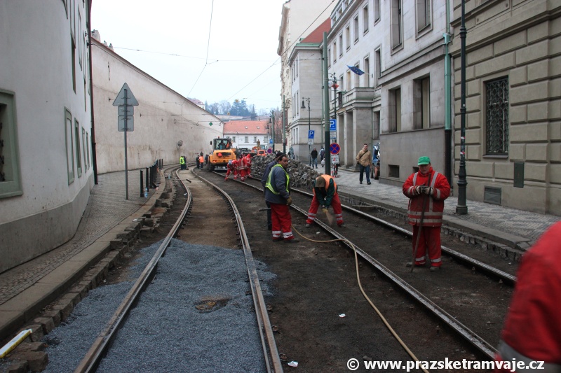 Jako první se stavbaři vrhli na opravu kolejového rozvětvení Újezd od Malostranského náměstí. Zde byla v průběhu noci z pátku na sobotu z 8. na 9. března 2013 vytrhána velká žulová dlažba a připraveno trolejové vedení pro bourací práce. V průběhu soboty byla vytrhána a odvezena původní kolejová konstrukce a připraven nový materiál.
