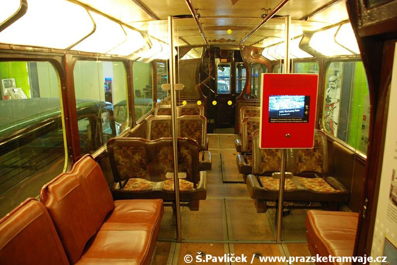 Pohled na samostatnou kabinu řidiče a vlevo schody do patra. | 14.6.2014 „Přízemí“ tramvaje je ještě vcelku normální. | 14.6.2014 Jakžtakž se mi ale podařilo nafotit i horní patro a tady musím přiznat, že luxusnější tramvaj jsem ještě neviděl. Asi byla nahoře „business class“. | 14.6.2014
