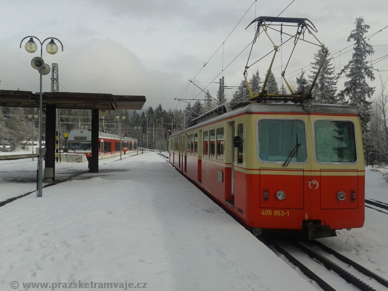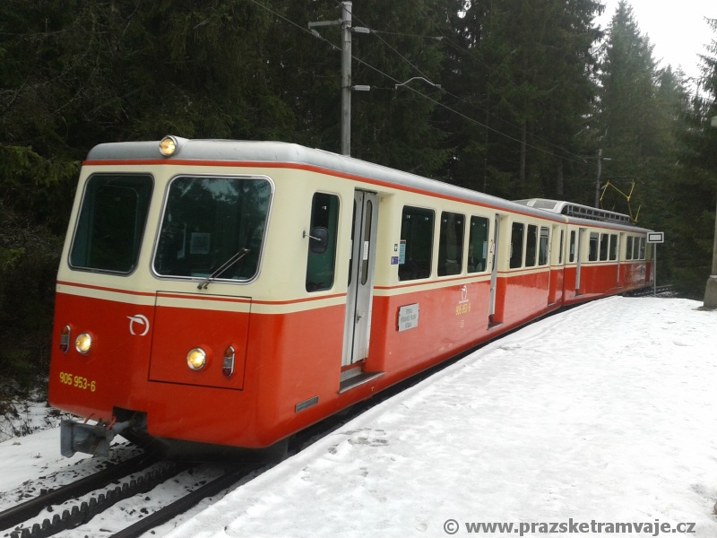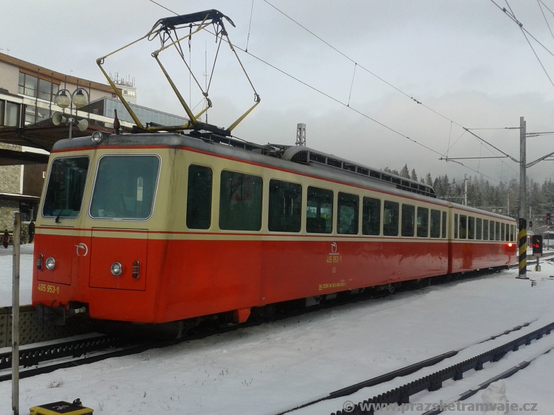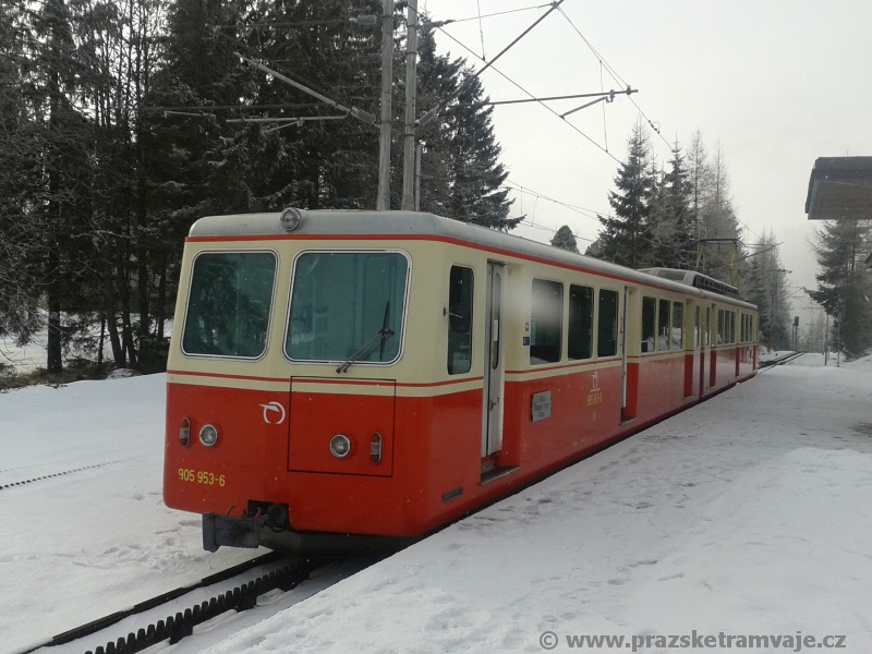 Ozubnicová jednotka řídícího a motorového vozu 905 953-6+405 953-1 vjíždí do jediné mezistanice tratě Tatranský Lieskovec. | 15.1.2014 Ozubnicová jednotka řídícího a motorového vozu 905 953-6+405 953-1 na Štrbském plese. | 15.1.2014 Za chladného lednového rána vyčkává ozubnicová jednotka motorového a řídícího vozu 405 953-1+905 953-6 na Štrbském plese. | 15.1.2014