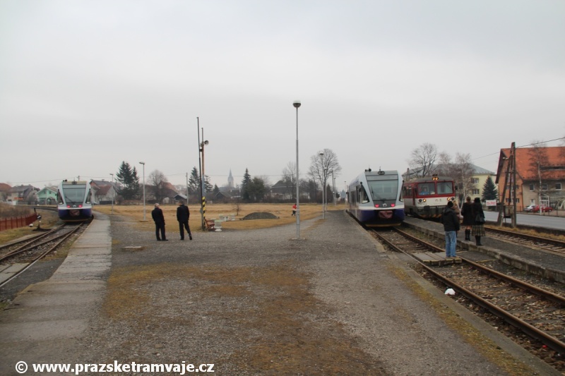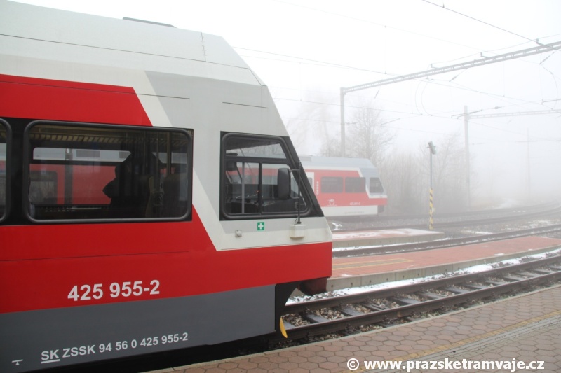 Motorové jednotky 840 005-3 a 840 004-6 vyčkávají na příjezd motorového vozu do Popradu. | 15.1.2014 Stanice Studený potok je důležitým přestupním bodem. V jeden okamžik se zde sjíždí vlaky do Tatranské Lomnice (jednotka 840 005-3), od Popradu (jednotka 840 004-6) a k Popradu (motorový vůz 812 060-6). | 15.1.2014 Motorová jednotka 840 005-3 je připravena k odjezdu do Tatranské Lomnice. | 15.1.2014
