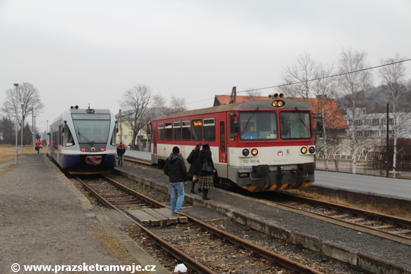 Motorová jednotka 840 004-6 mířící do Kežmaroku se ve Studeném potoku křižuje s motorovým vozem 812 060-6. | 15.1.2014