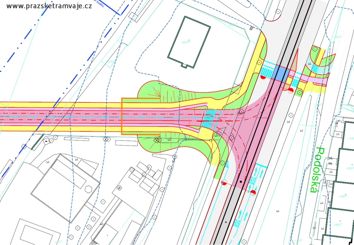 K Podolské vodárně se tramvaje přiblížily 31. července 1910, když po dokončení Vyšehradského tunelu a nábřežních zdí byl zahájen provoz na novostavbě tramvajové tratě od Palackého náměstí. Plně dvoukolejná trať tehdy odbočovala z nábřeží do dnešní Podolské ulice a končila krátkým jednokolejným obratištěm na nároží se Sinkulovou ulicí. Dne 25. června 1922 bylo uvedeno do provozu prodloužení tramvajové tratě vedené dnešní Podolskou ulicí až k Cementárně (tedy do již zmíněného prostoru, kde je dnes plavecký stadion). O dva roky později, 15. srpna 1924, bylo do provozu uvedeno prodloužení tramvajové tratě v podobě jednokolejné tratě Cementárna – Braník (Lomy) s jednou výhybnou (bez zastávky). Ve stanici Cementárna bylo vložením křížového přejezdu zřízeno obratiště vlečných vozů. Již o rok později však byla postavena druhá kolej, zprovozněná 3. července 1925. V padesátých letech minulého století proběhla výstavba Podolského nábřeží, tzv. pravobřežní komunikace. Tramvajová trať byla etapovitě překládána z Podolské ulice do středu nově vznikajícího Podolského nábřeží. První část přeložky, od dnešního plaveckého stadionu po nově zřízenou smyčku Dvorce, byla dokončena 21. května 1952. Stará trať v Podolské ulici byla v tomto úseku zrušena. V roce 1956 byla k 15. červnu dokončena poslední etapa přeložky tramvajové tratě z Podolské ulice na Podolské nábřeží a byl tak ukončen provoz na staré trati přes Nedvědovo náměstí. V souvislosti s historií tramvajové tratě musíme připomenout zprovoznění plaveckého stadiónu v Podolí v roce 1965 v prostoru někdejší cementárny. Není totiž bez zajímavosti, že u něj nikdy nebyla zřízena zastávka, přestože stadion leží zhruba v polovině mezi Kublovem a Dvorci, vzdálenými od sebe takřka kilometr, takže každý z poměrně velkého počtu návštěvníků musí ujít skoro půl kilometru tam (a stejnou délku zpět), aby ke stadionu došel. V roce 1982 byla tramvajová trať rekonstruována metodou velkoplošných panelů BKV, které zde vydržely až do roku 2011, kdy je po rekonstrukci nahradila klasická konstrukce na pražcích s otevřeným svrškem a bezžlábkovými kolejnicemi S49, použitými zde jako na čtvrtém místě v Praze. Od roku 2003 probíhaly ve veřejném prostoru debaty o potřebě zřízení nového mostu přes řeku Vltavu, který by propojil oblast Dvorců se smíchovskou stranou. Most byl plánován jako silniční a tramvajový, nakonec došlo k rozhodnutí, že bude určen pro pěší, cyklisty, autobusy, tramvaje a složky IZS. V původních návrzích most ústil na pravém břehu Vltavy v ose Jeremenkovy ulice, nakonec byl pravobřežní konec mostu situován do úrovně jižního okraje areálu plaveckého stadionu v Podolí, mezi Žluté lázně a plavecký stadion, severně od Jeremenkovy ulice. Levobřežní poloha v oblasti smíchovského Lihovaru je v podstatě od počátku neměnná. Stavba mostu byla zahájena 13. září 2022. Zatímco na smíchovské straně byl zřízen zárodek kolejové křižovatky u Lihovaru již v roce 2020, během rekonstrukce Nádražní ulice, na straně podolské křižovatka začala vznikat až v roce 2023 během výluky v termínu 1. dubna – 15. května 2023. Aby nebylo nutné znovu zásadně omezit dopravu po rozsáhlé výluce v souvislosti s napojováním nové tratě do Libuše a opravou tratě v úseku Nádraží Braník – Levského a přejezdu přes komunikaci u zastávky Přístaviště, došlo k vzájemné koordinaci těchto akcí. Do tratě tak byly vloženy obě rozjezdové a sjezdové výhybky, včetně odbočných větví, zatím ukončených na okraji levého jízdního pruhu pro automobily. Oproti křižovatce Lihovar jsou zde umístěné srdcovky průjezdné i do oblouků křižovatky. Důvodem je kratší časový úsek do zahájení provozu i v odbočných větvích.