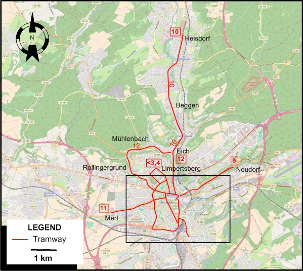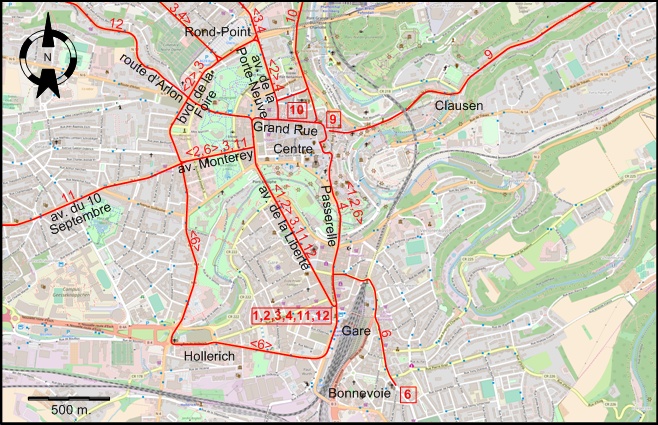 Již před rokem 2010 tak začaly být na páteřní linku z Hlavního nádraží přes centrum a Kirchberg na letiště nasazovány tříčlánkové velkokapacitní autobusy VanHool AGG300, Hess LightTram a jejich hybridní nástupci VanHool Exquicity a Hess Urevo, ale ani to situaci nedokázalo vyřešit. Z historického hlediska stojí za zmínku, že Lucemburk měl v minulosti tramvajovou síť délky přes 30 km s devíti linkami, ta byla ale od počátku šedesátých let podobně jako jinde utlumována ve prospěch autobusů. Její provoz byl zcela ukončen v roce 1964 a nyní je připomínán v místním muzeu MHD Tramsmusée s pár stovkami metrů zatrolejovaných kolejí, otevřeném roku 1991 ve čtvrti Hollerich. Stav sítě v době největšího rozmachu sítě (v roce 1952) ilustrují mapy od autora Gabor Sandi (podklady OpenStreetMap, licence CC-BY-SA), pod obrázky naleznete podrobnější informace o tehdejší síti.