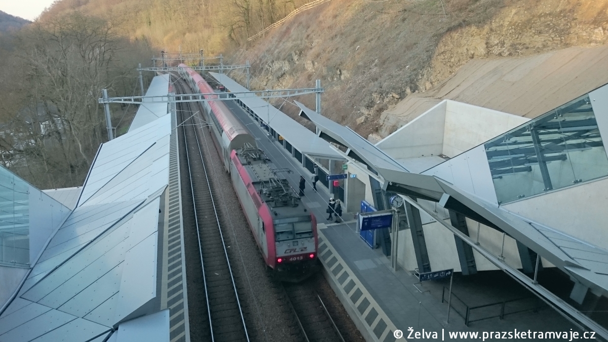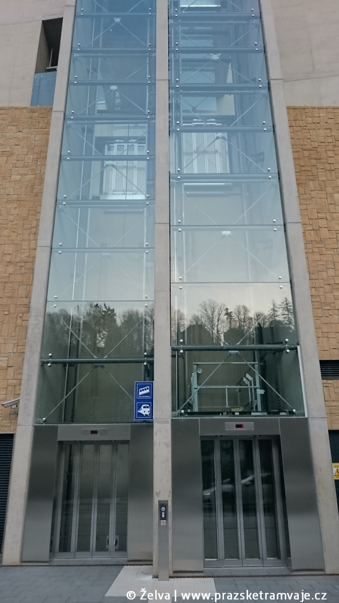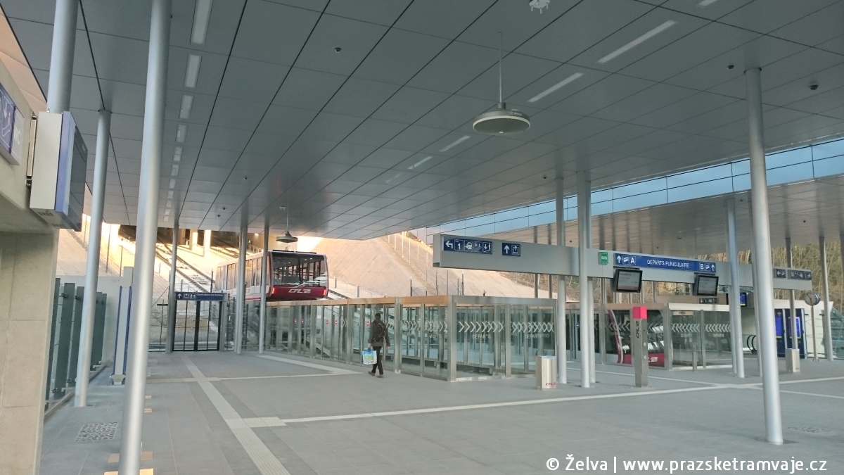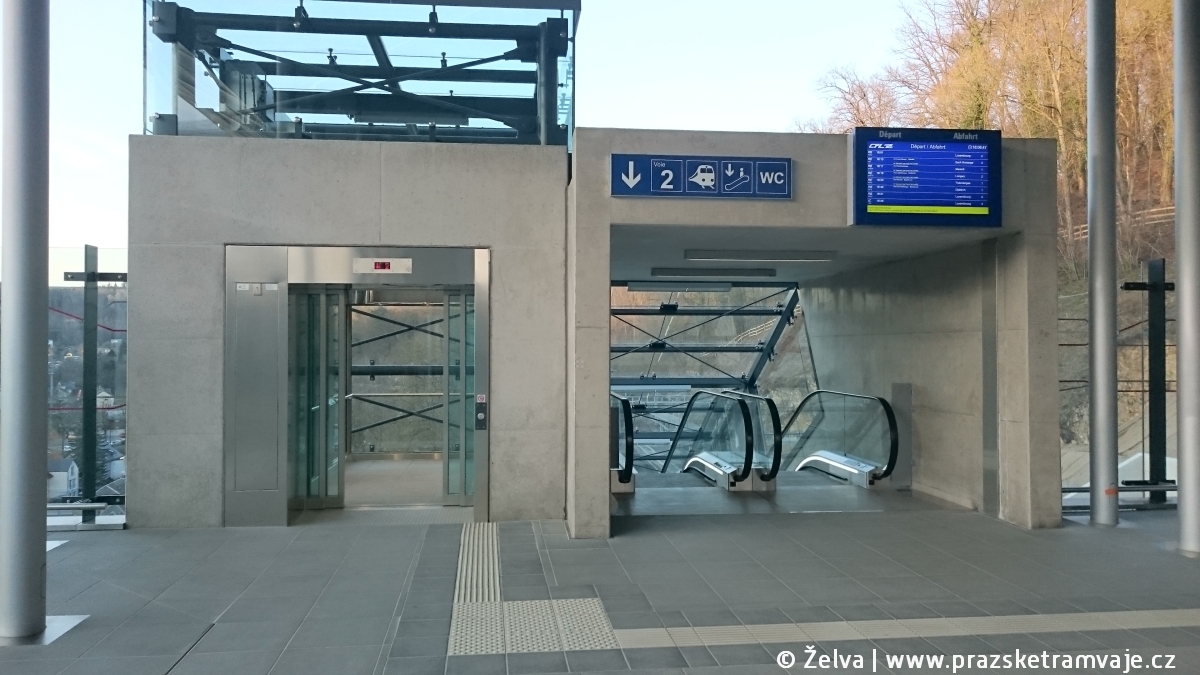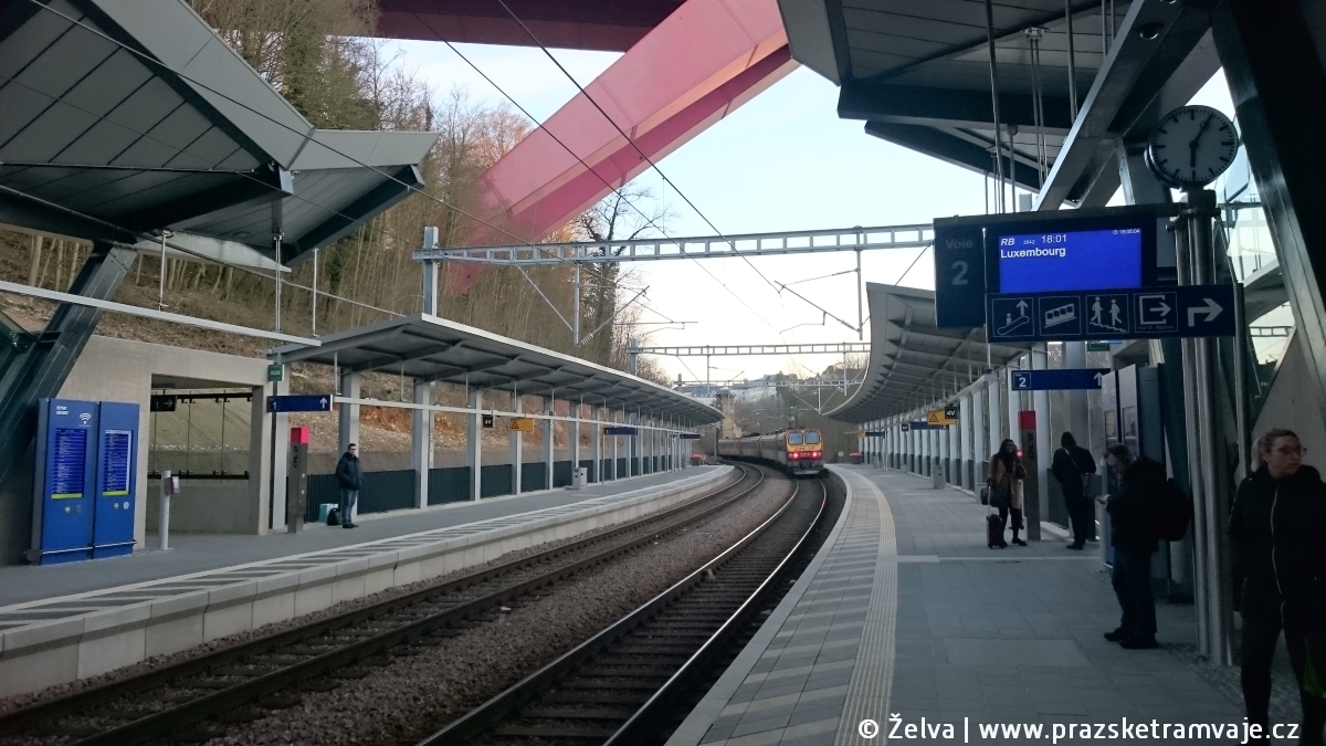 Pro přestup na železnici byla vybudována nové stanice Pfaffenthal-Kirchberg na stávající trati ve svahu pod mostem Rout Bréck. Zastávka tramvaje Rout Bréck / Paffendal (název je na rozdíl od železniční stanice v lucemburštině) je s železniční stanicí propojena dvěma dvojicemi velkokapacitních kabinových lanovek, odjíždějících v cyklech v řádech jednotek minut. Dále do údolí, do čtvrti Pfaffenthal (pardon, Paffendal), je z železniční stanice možné pokračovat po venkovním schodišti nebo párem výtahů.